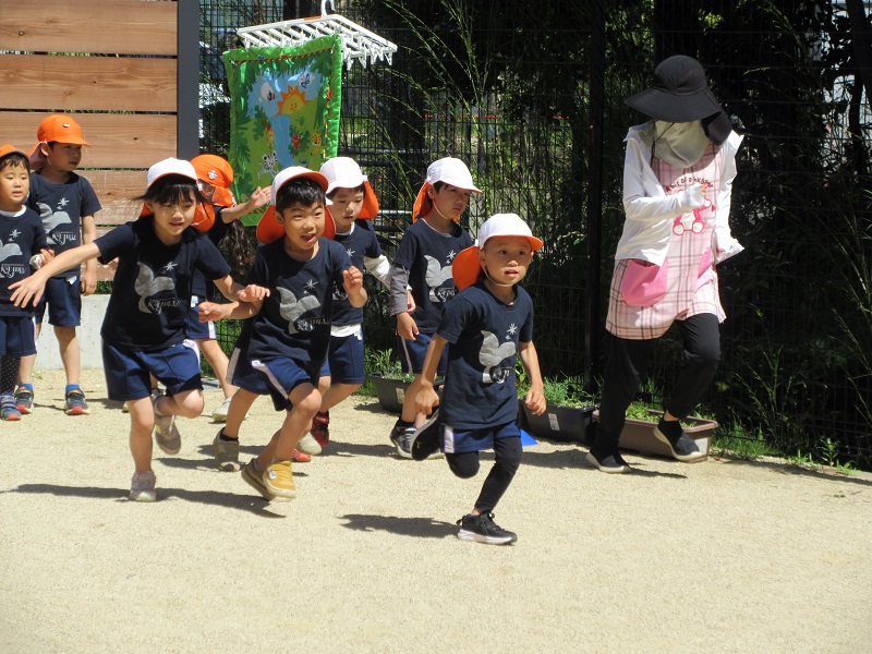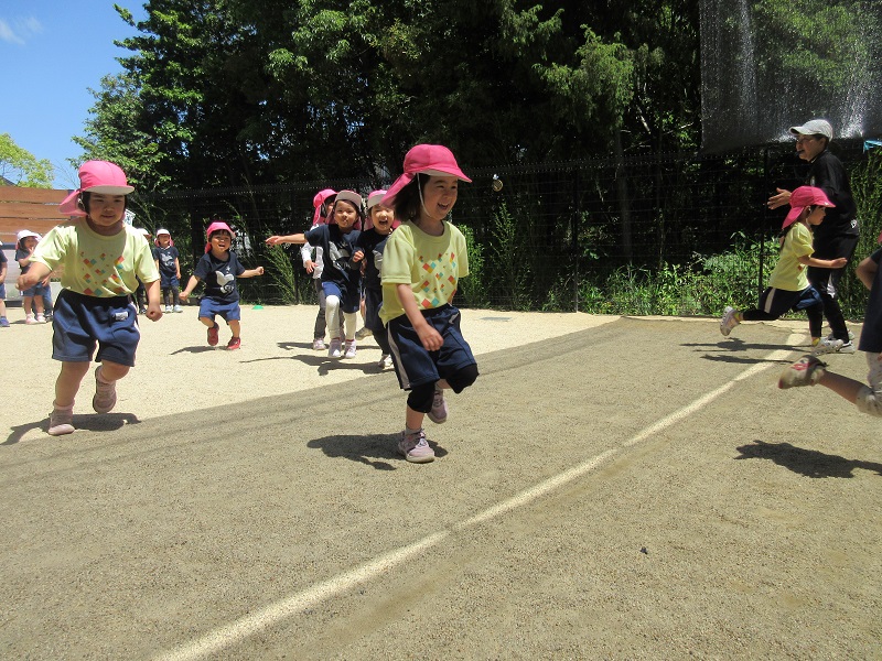 ウォーミングアップで園庭の端から端まで順番に走ります♪