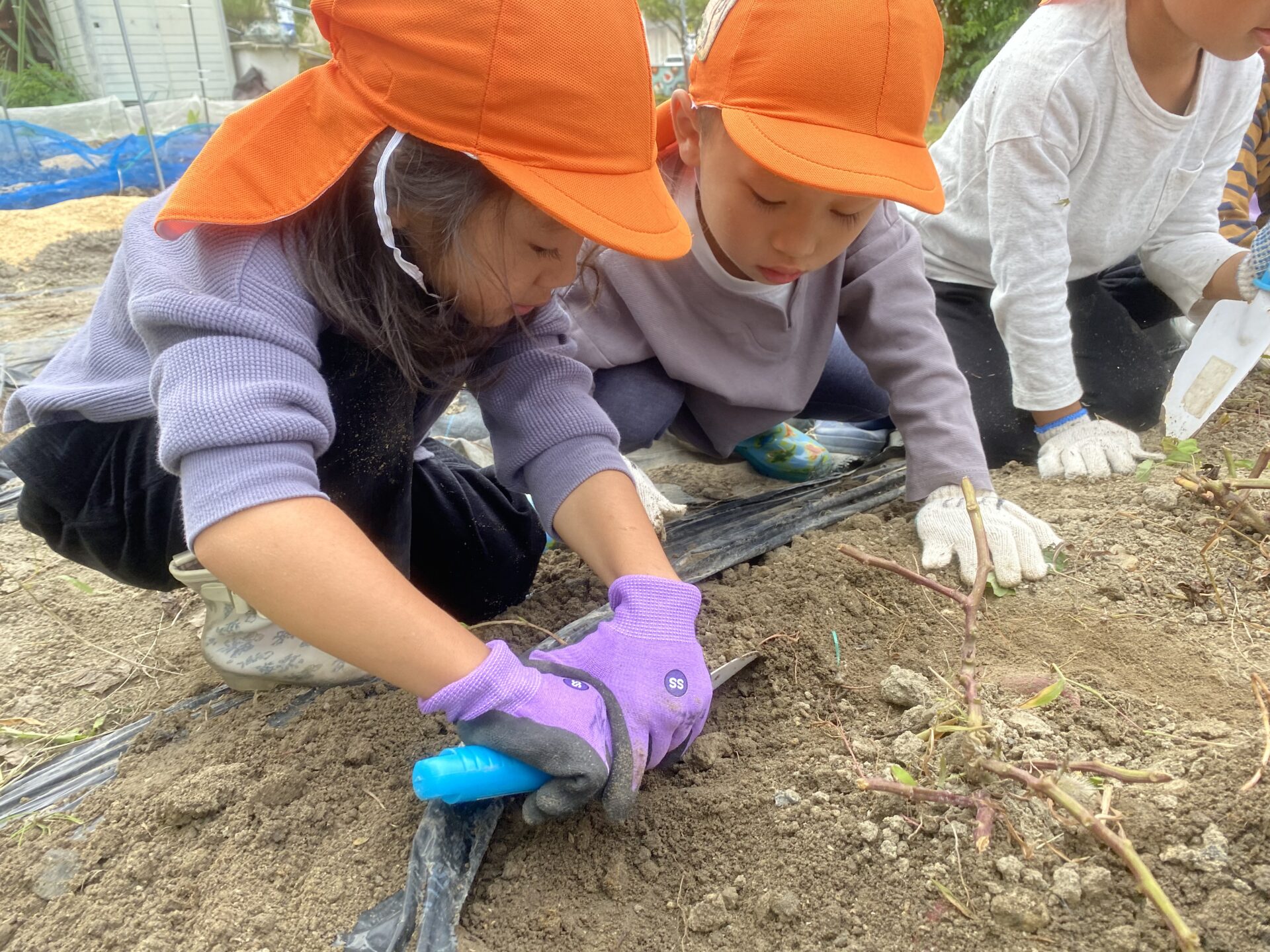 今日はくじらチームがお芋ほりに行きました!畑につくともうすでにお芋の顔が見えているのを見つけて「いっぱいとるぞ~」とやる気満々の子どもたち!