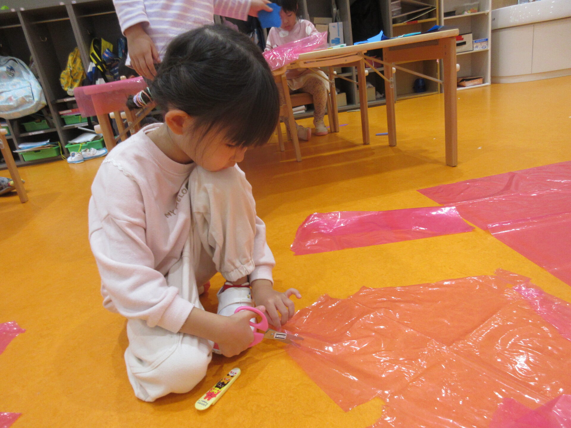 様々な色のカラーポリや、色画用紙の中から、自分で選んで、衣装を作りました🎃