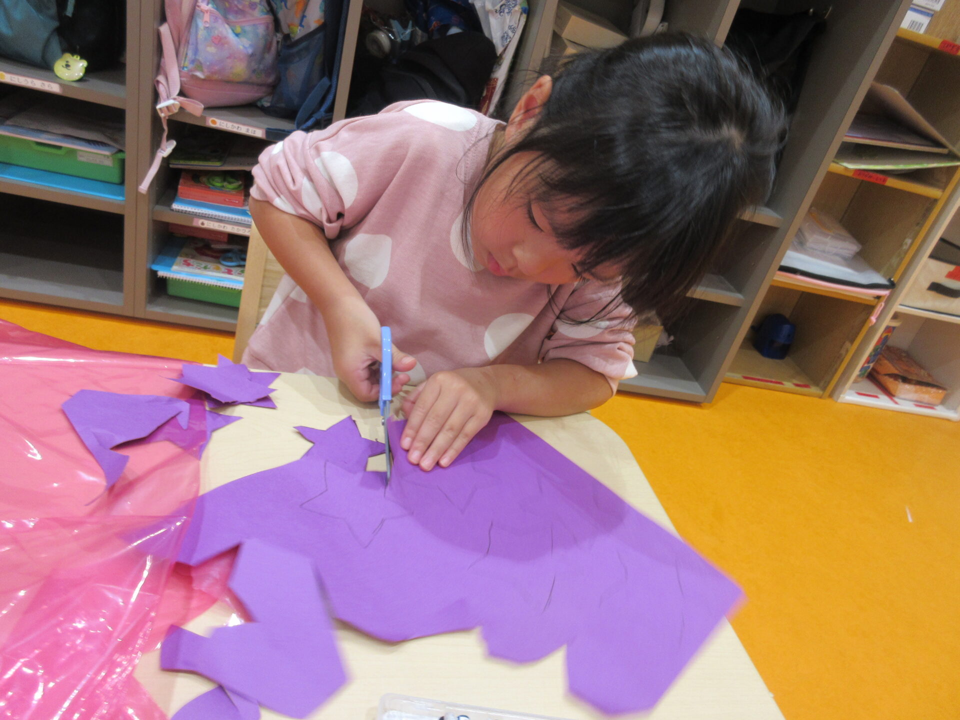「星たくさん貼りたい!」と言う子には、「一つ作ってあげるし、なぞって切れる?」とアドバイスしながら、”自分で”行う姿が見られました。