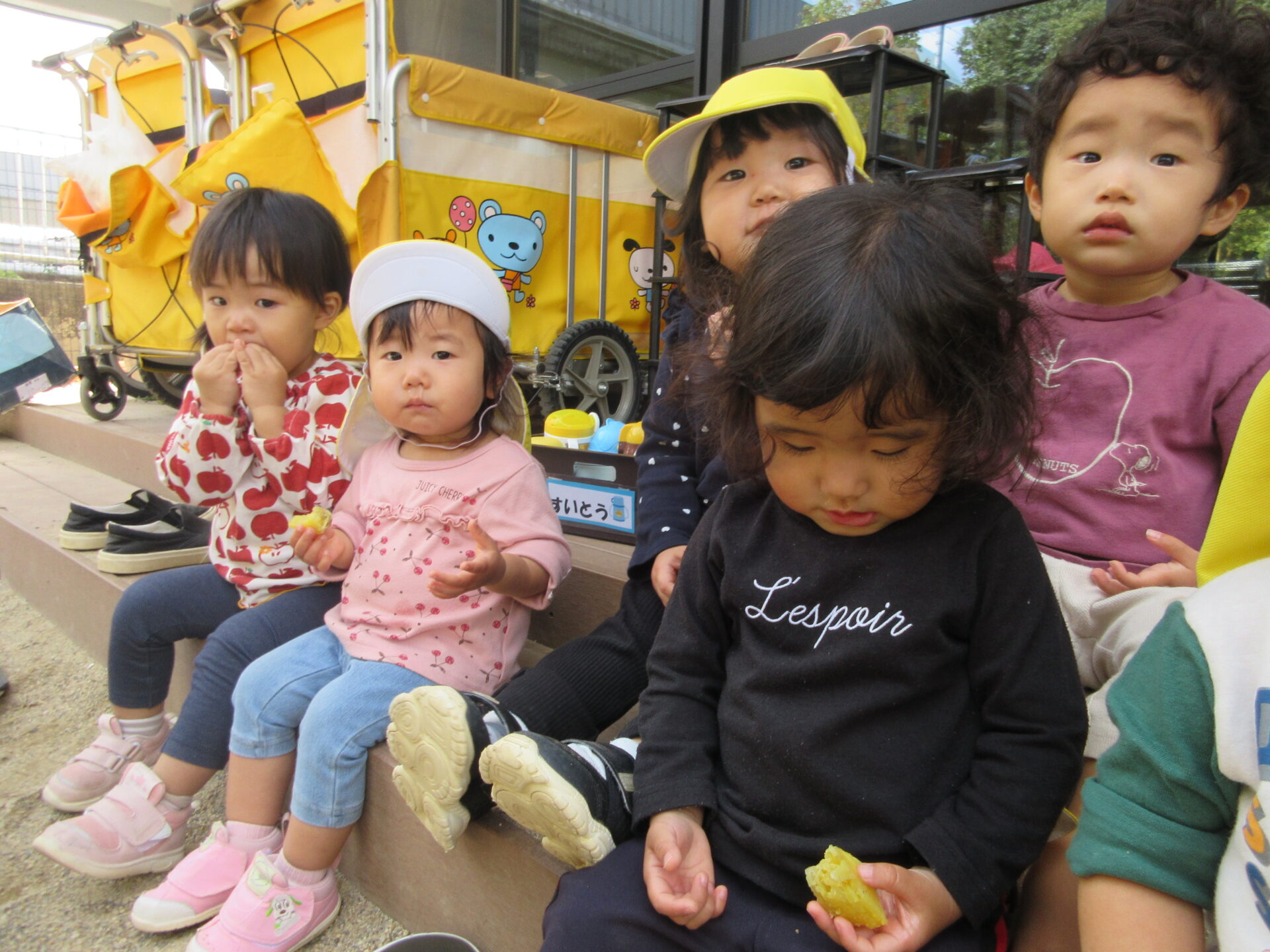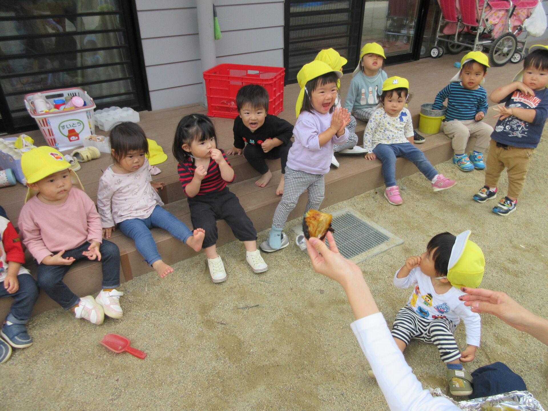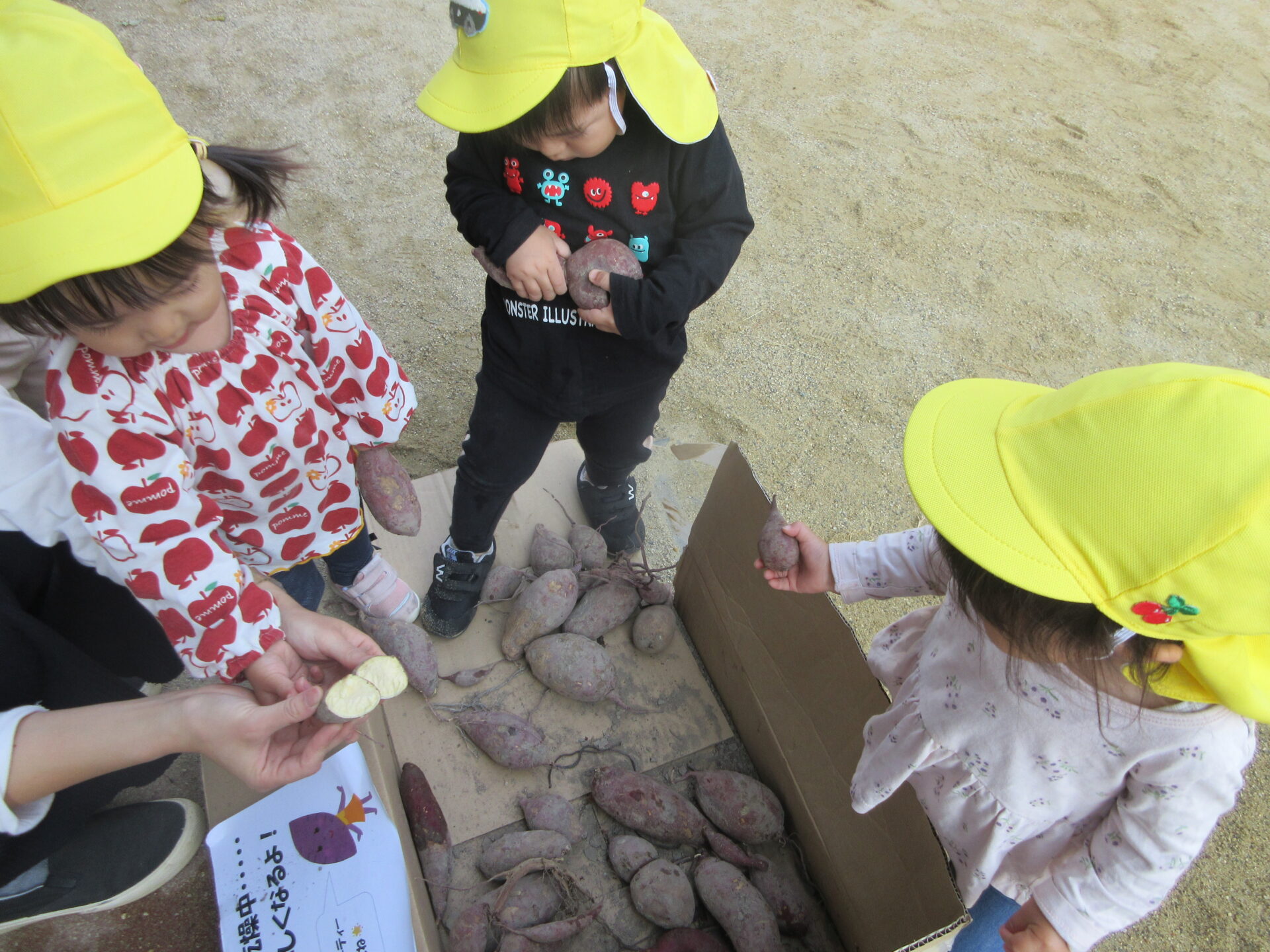 さつまいもを洗ったり、アルミホイルに巻いたり、、、だいちチームの子どもたちも興味津々でした😯さつまいもを幼児さんに触らせてもらうと、嬉しそうに答えていました♪一緒にお手伝いもさせてもらいました😊👍