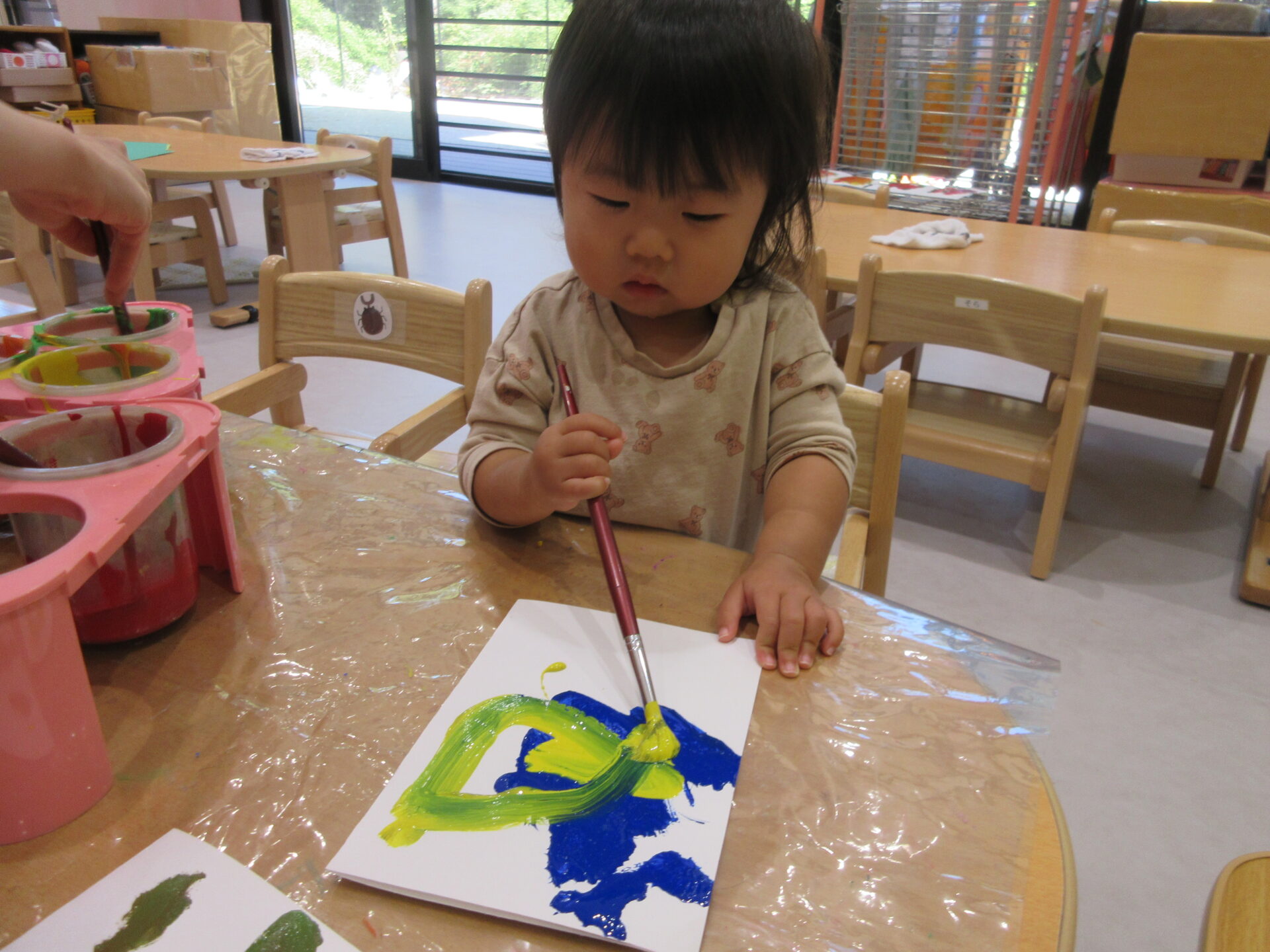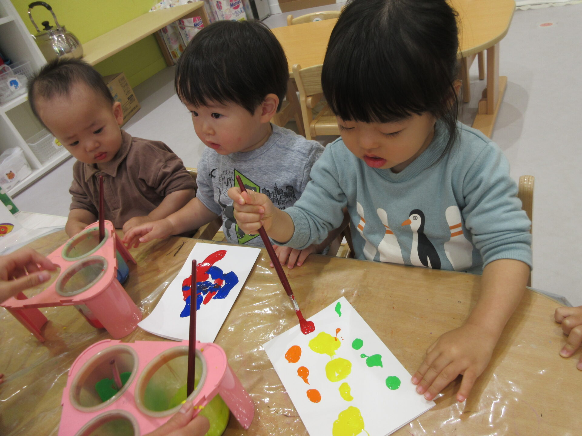 「あか」「あお」「おえんじ(おれんじ)」等と知っている色を指差ししながら教えてくれる子どもたち!やる気満々で筆を持ち、保育者と一緒に「ちょん ちょん」と言いながら筆を動かしていきます。