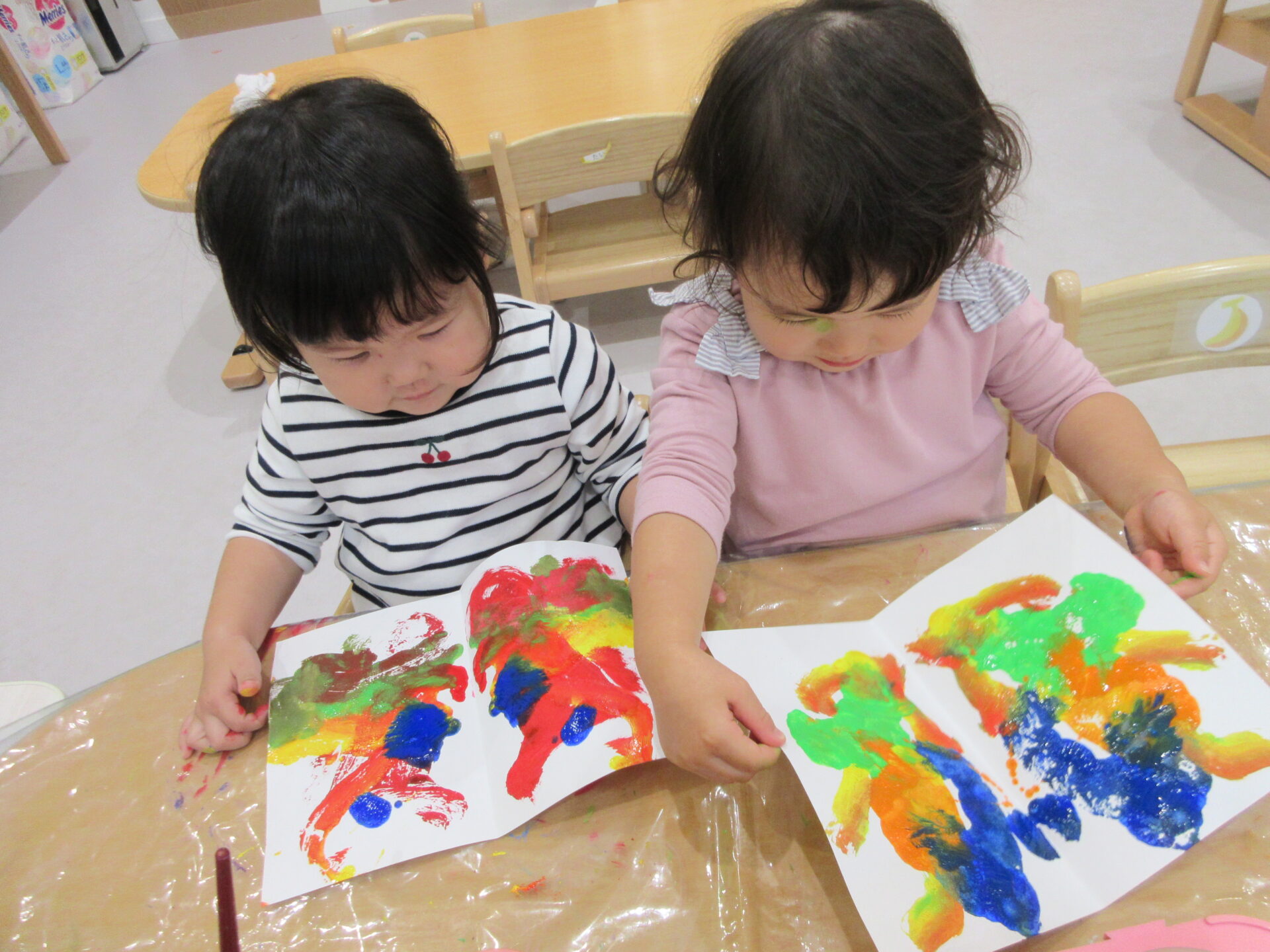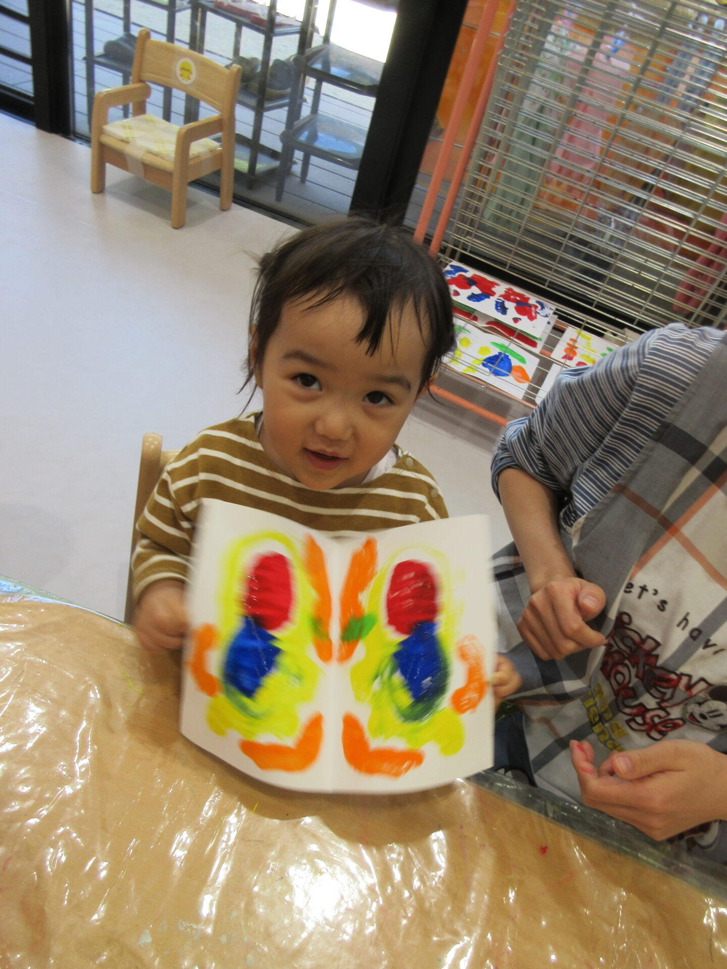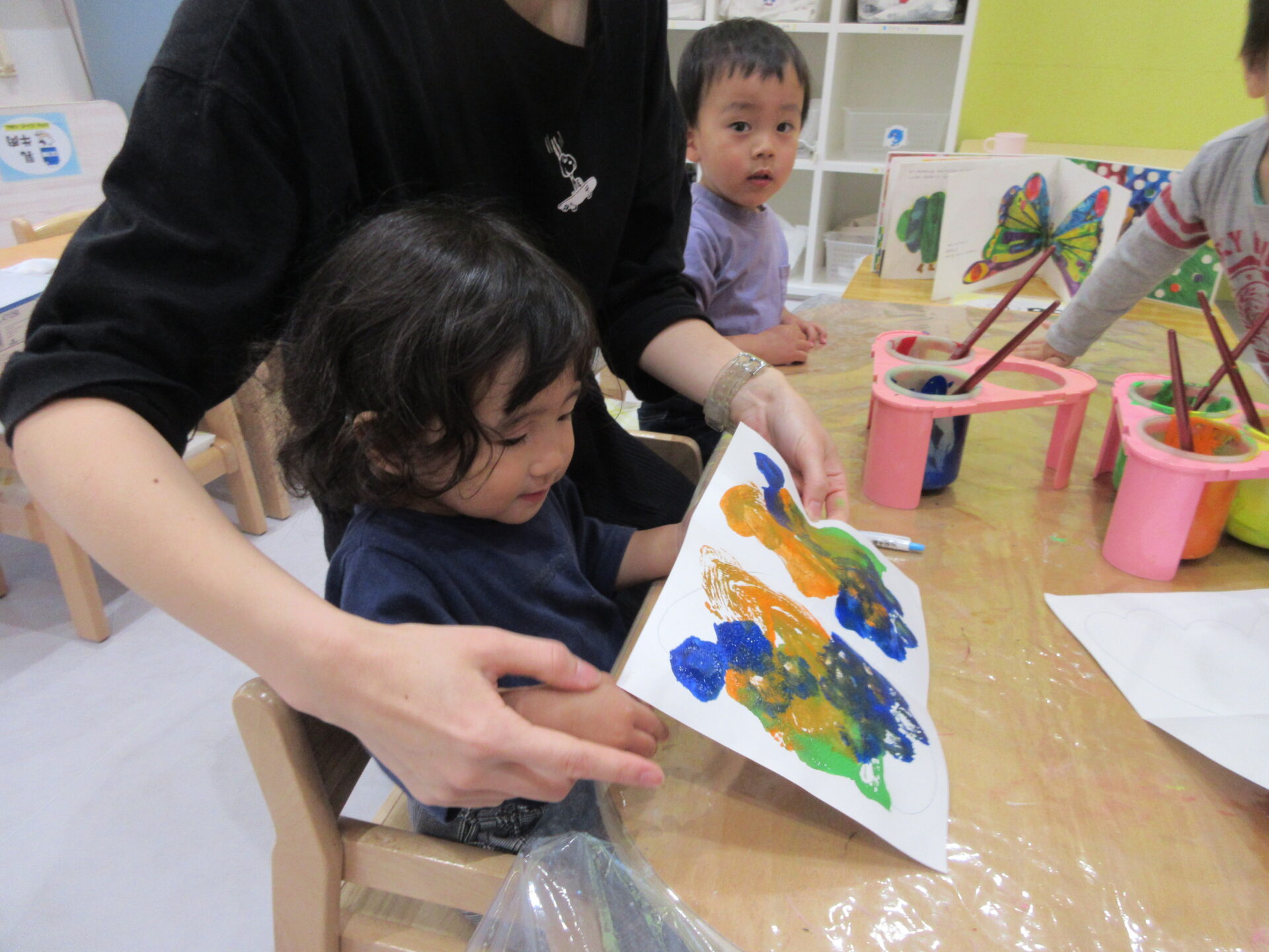 開いてみると、「わあ!!!」「ちょうちょ!」「ひらひら」等と言いながら目をキラキラと輝かせ、ちょうちょの羽のように紙をパタパタと動かしていました♪