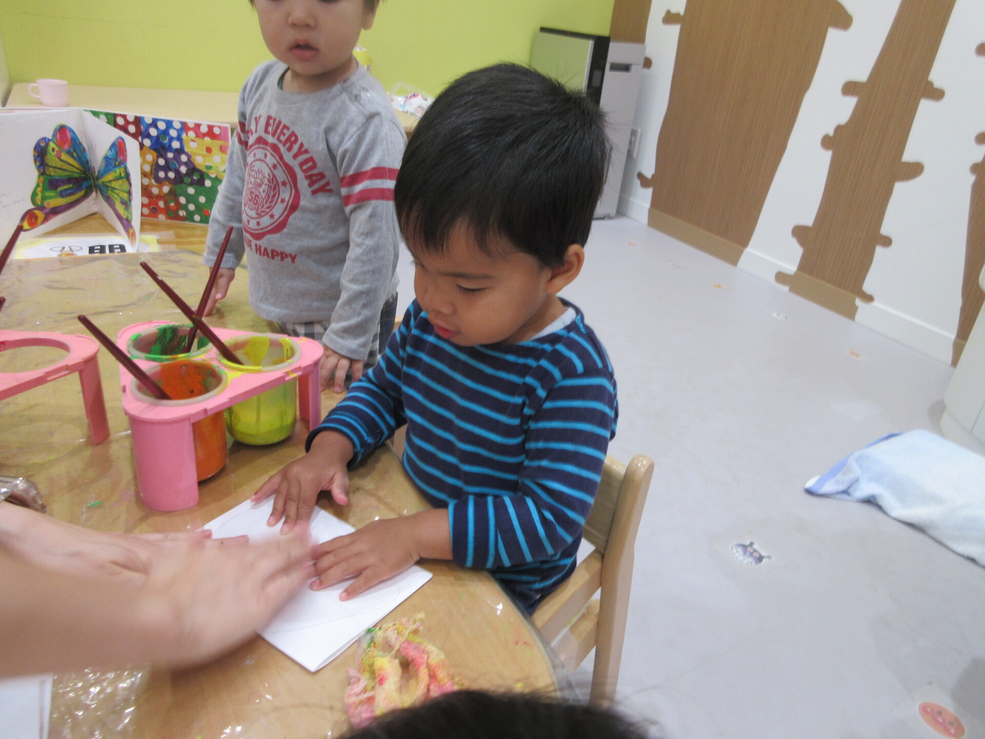 保育者と一緒に「いち、に、さん、し、、、、、」と数えながら紙の上から押しつけて、、、、