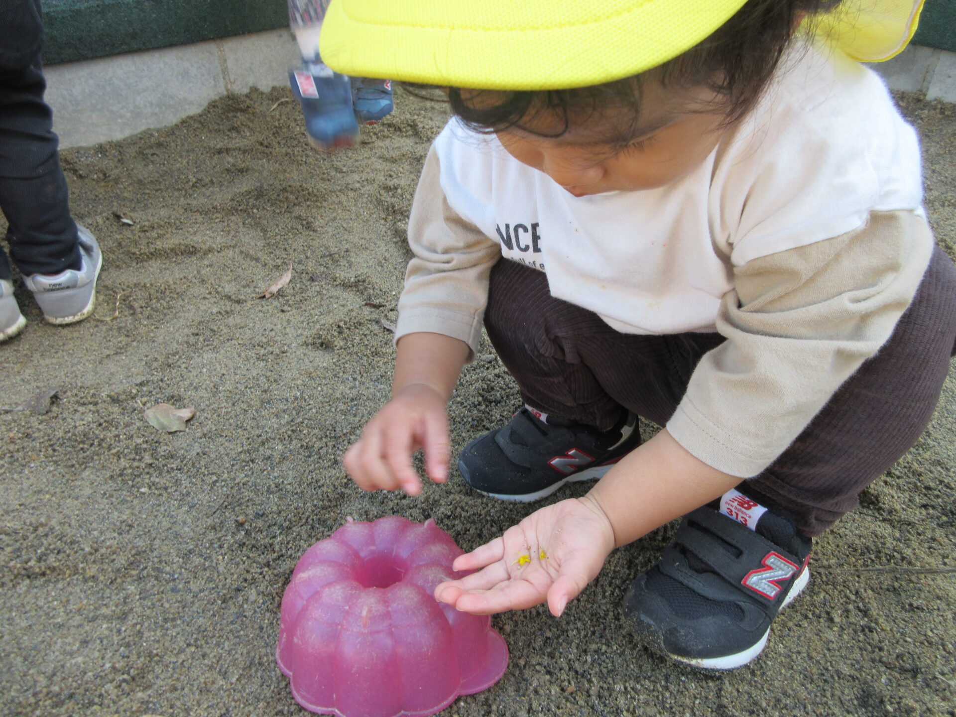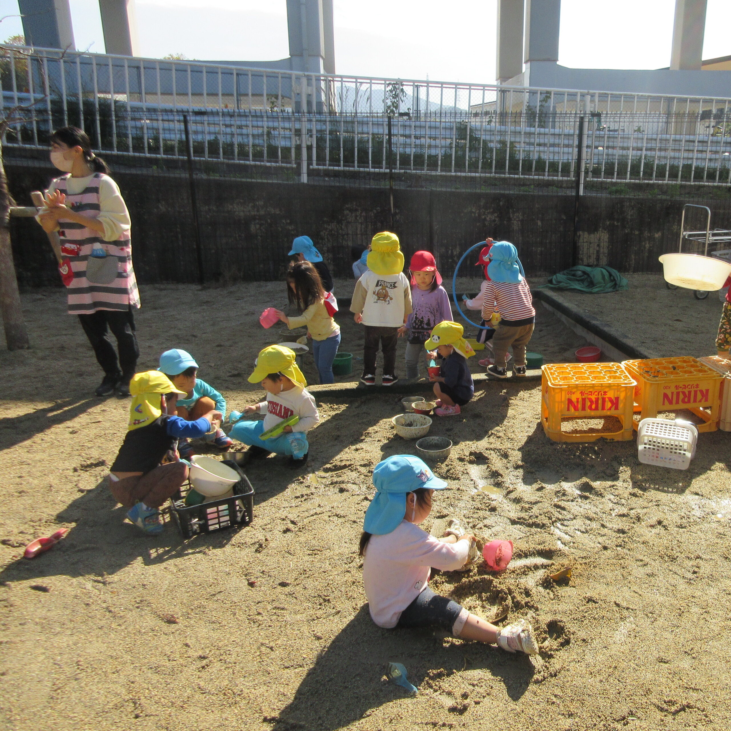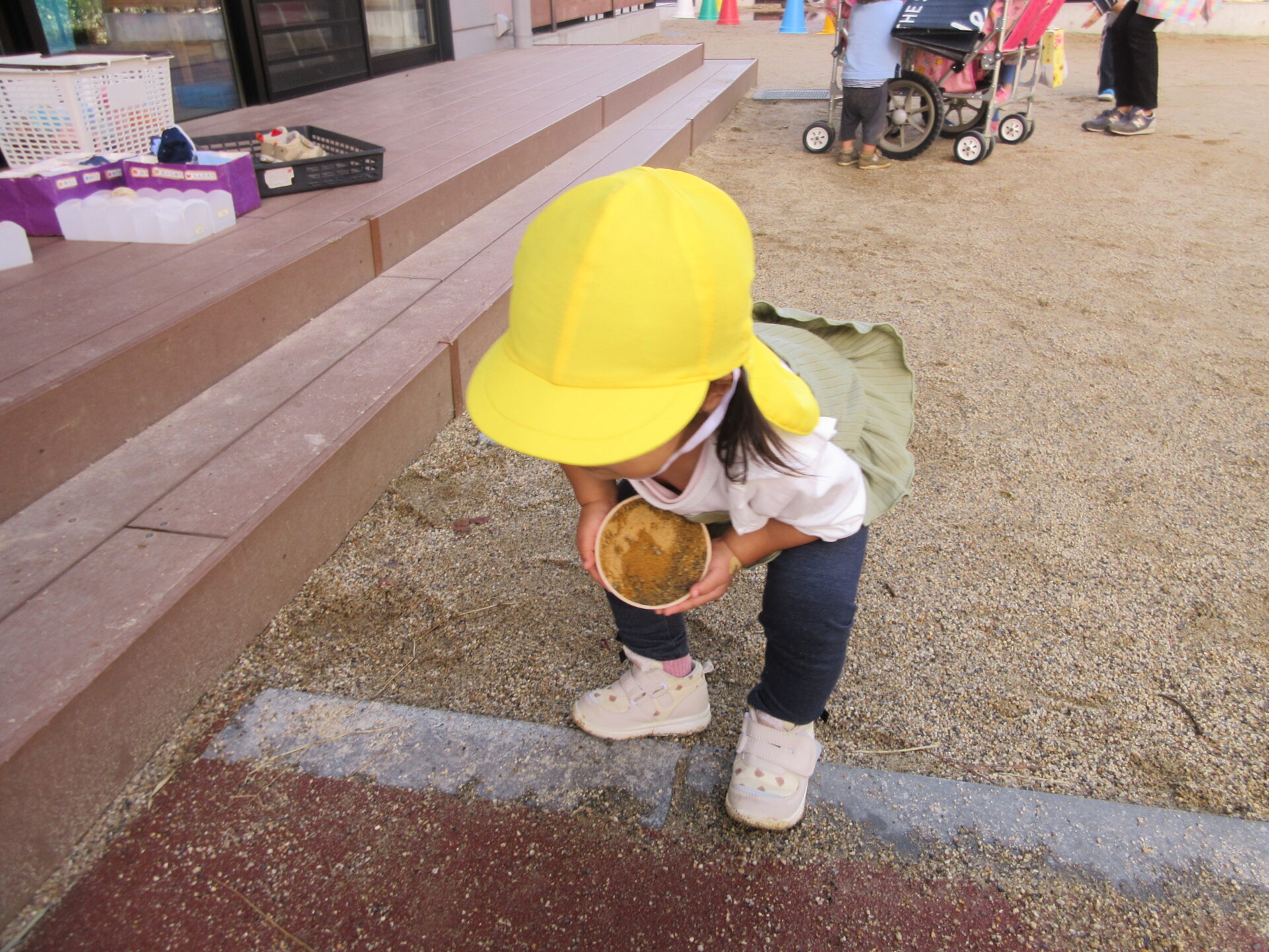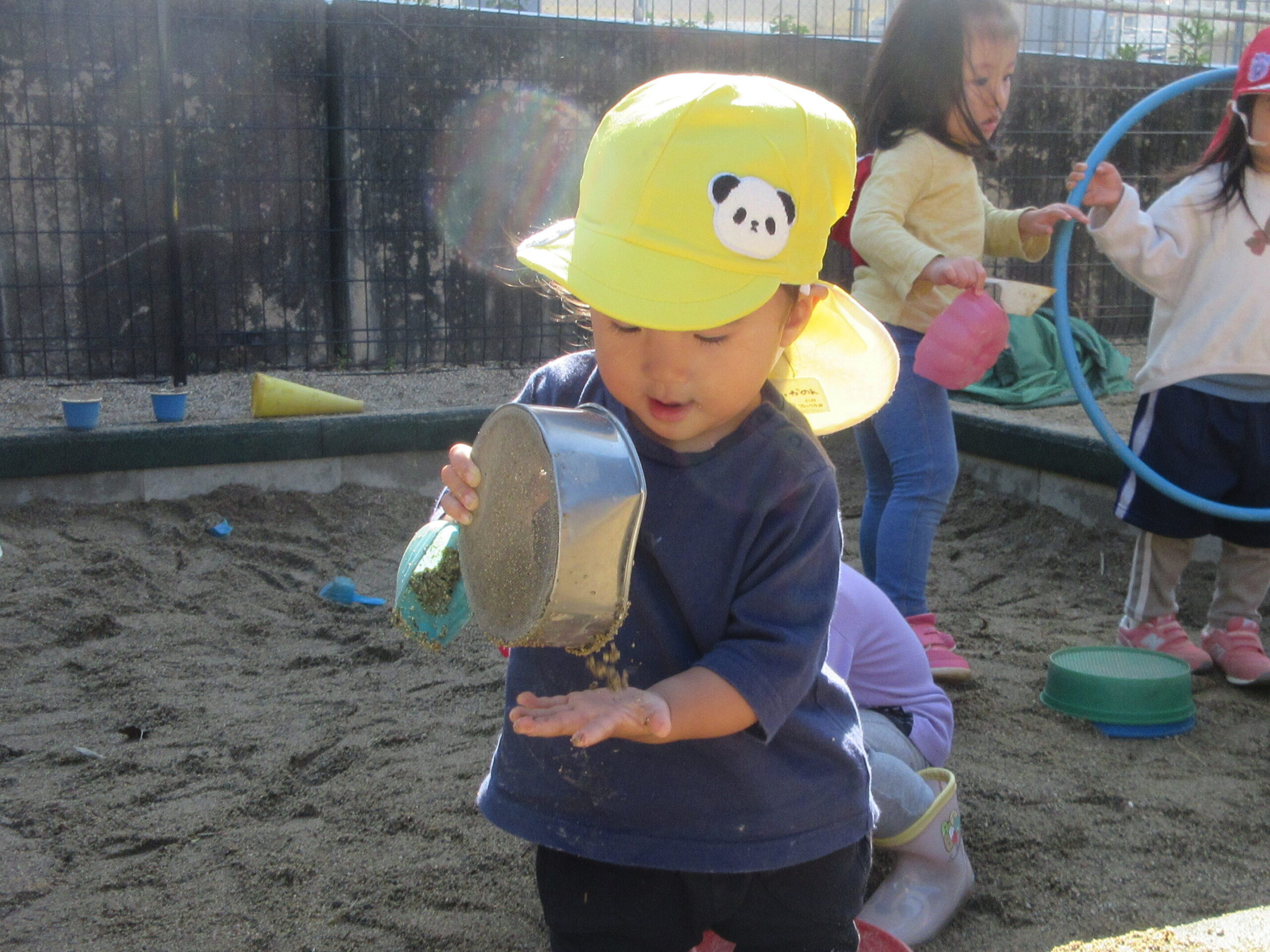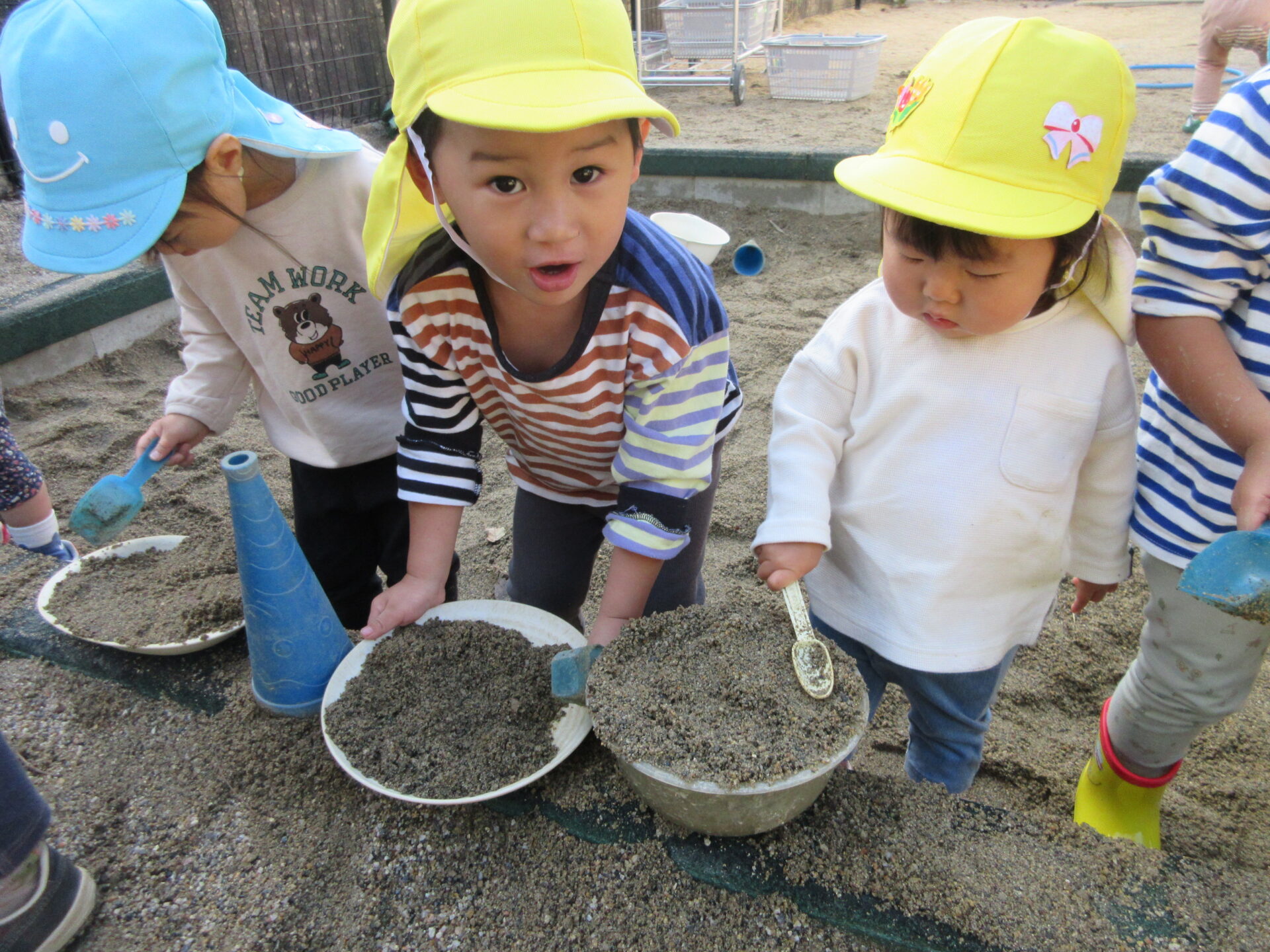 雨が降った後の砂場はいつものサラサラの砂と違い、ペタペタ、ドロドロとしていて不思議がいっぱい!!