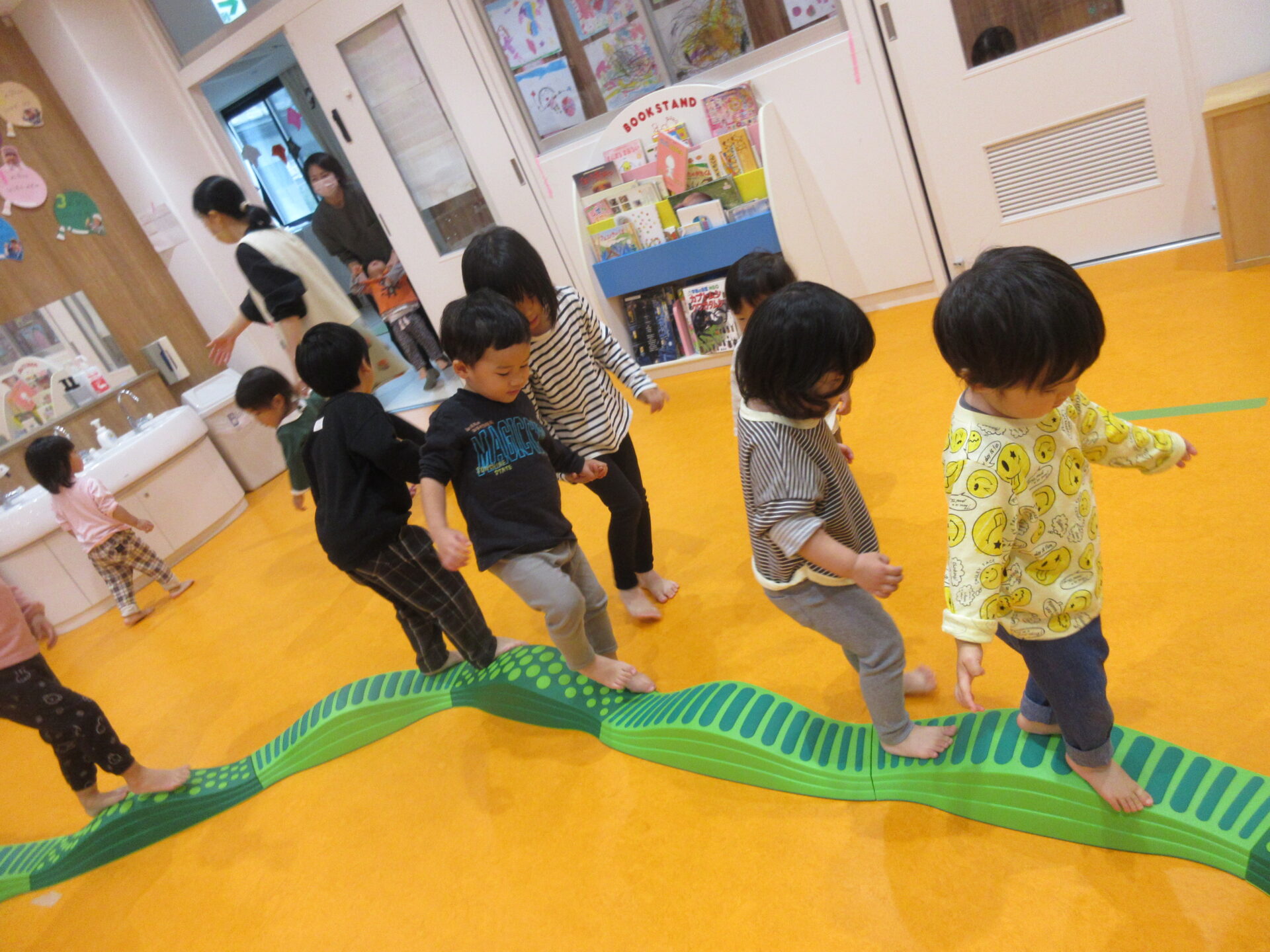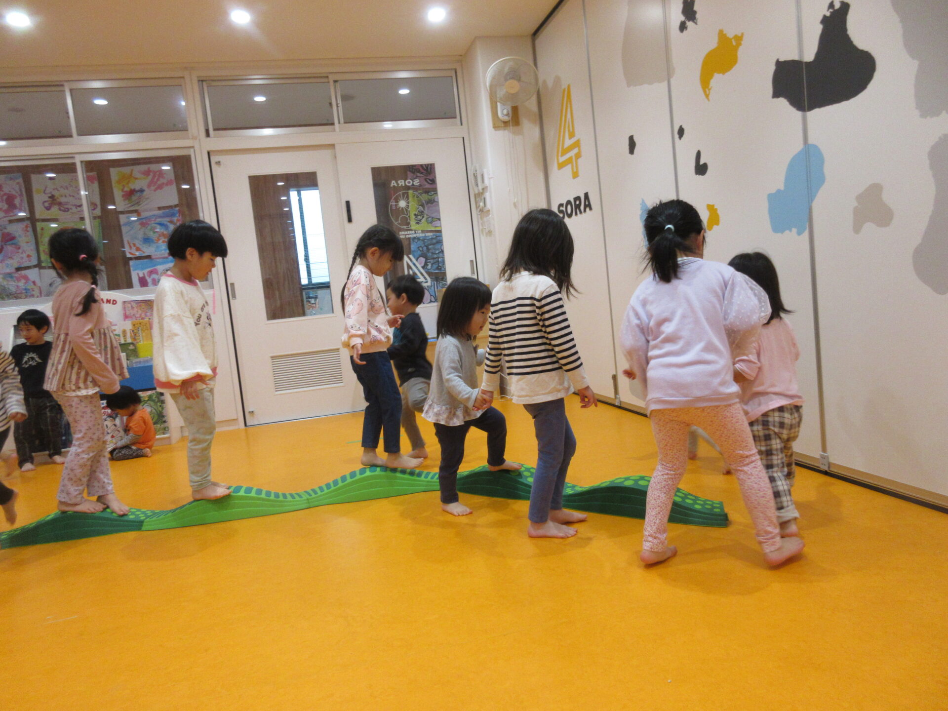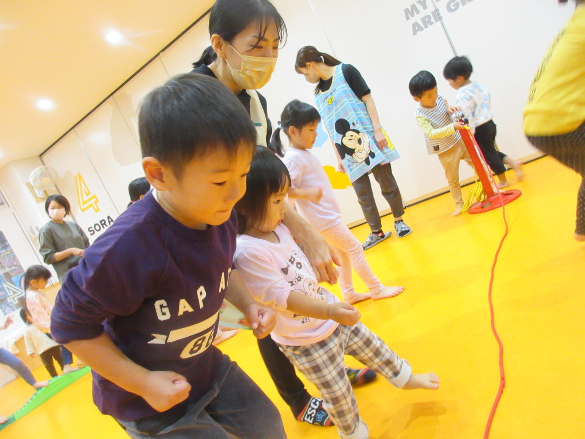 そらチームはだいちチームのお友だちと手を繋いだり、「こうやって飛ぶんだよ」と教えてあげたり優しくかかわる姿が見られました🥰