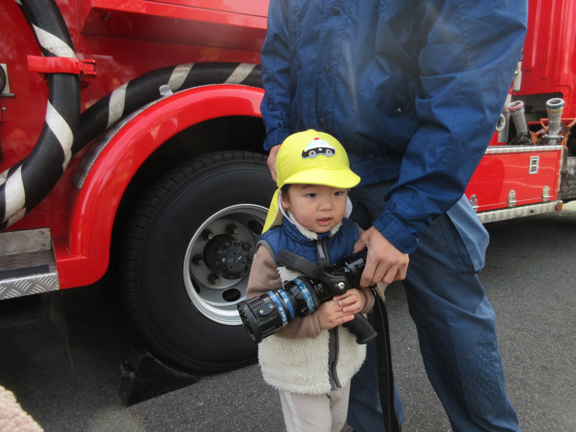 大きなホースを持ち消防士さんになりきりました✨