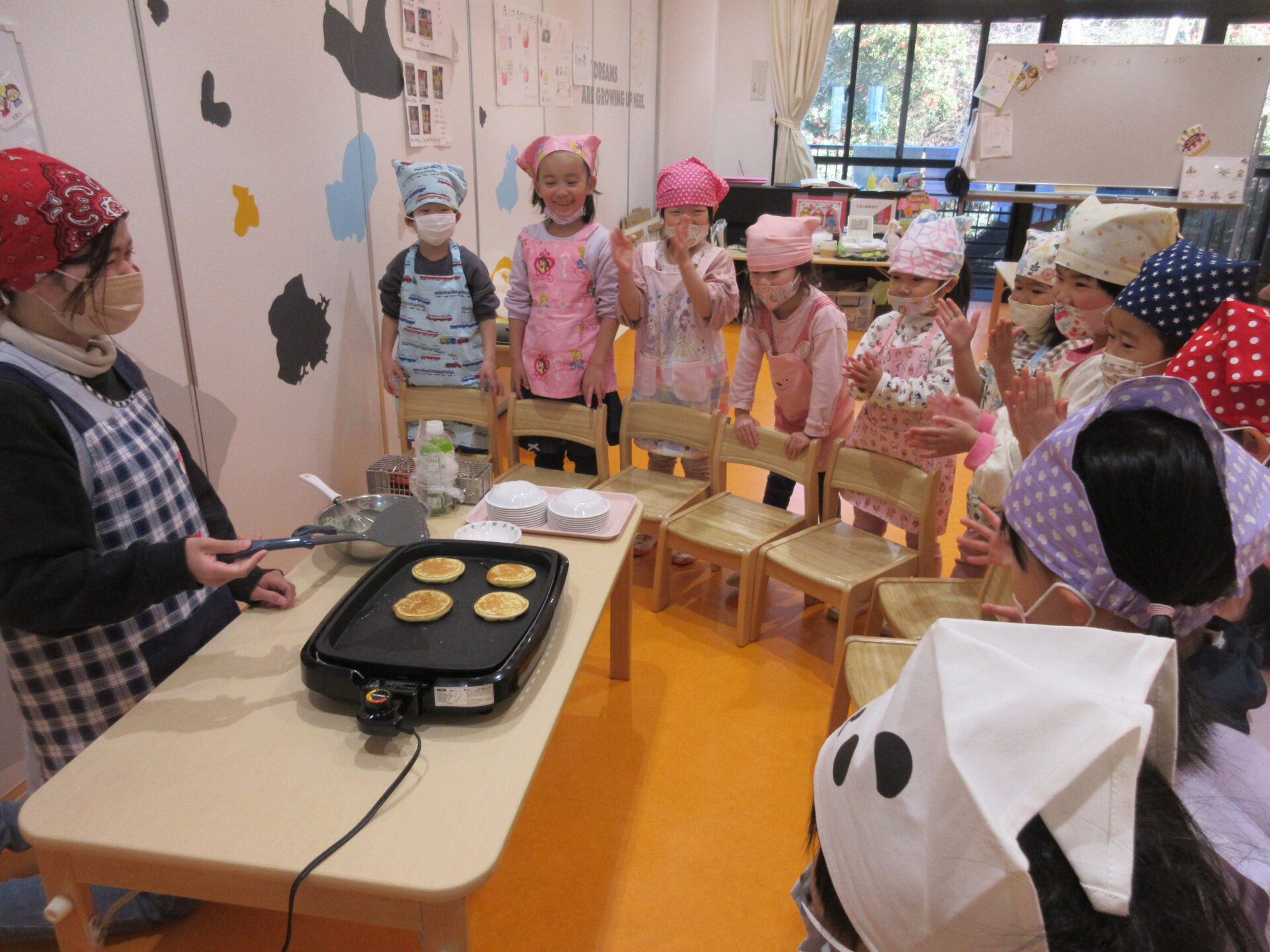 保育士が「それっ!」とホットケーキをひっくり返すと、拍手が沸き起こりました😆