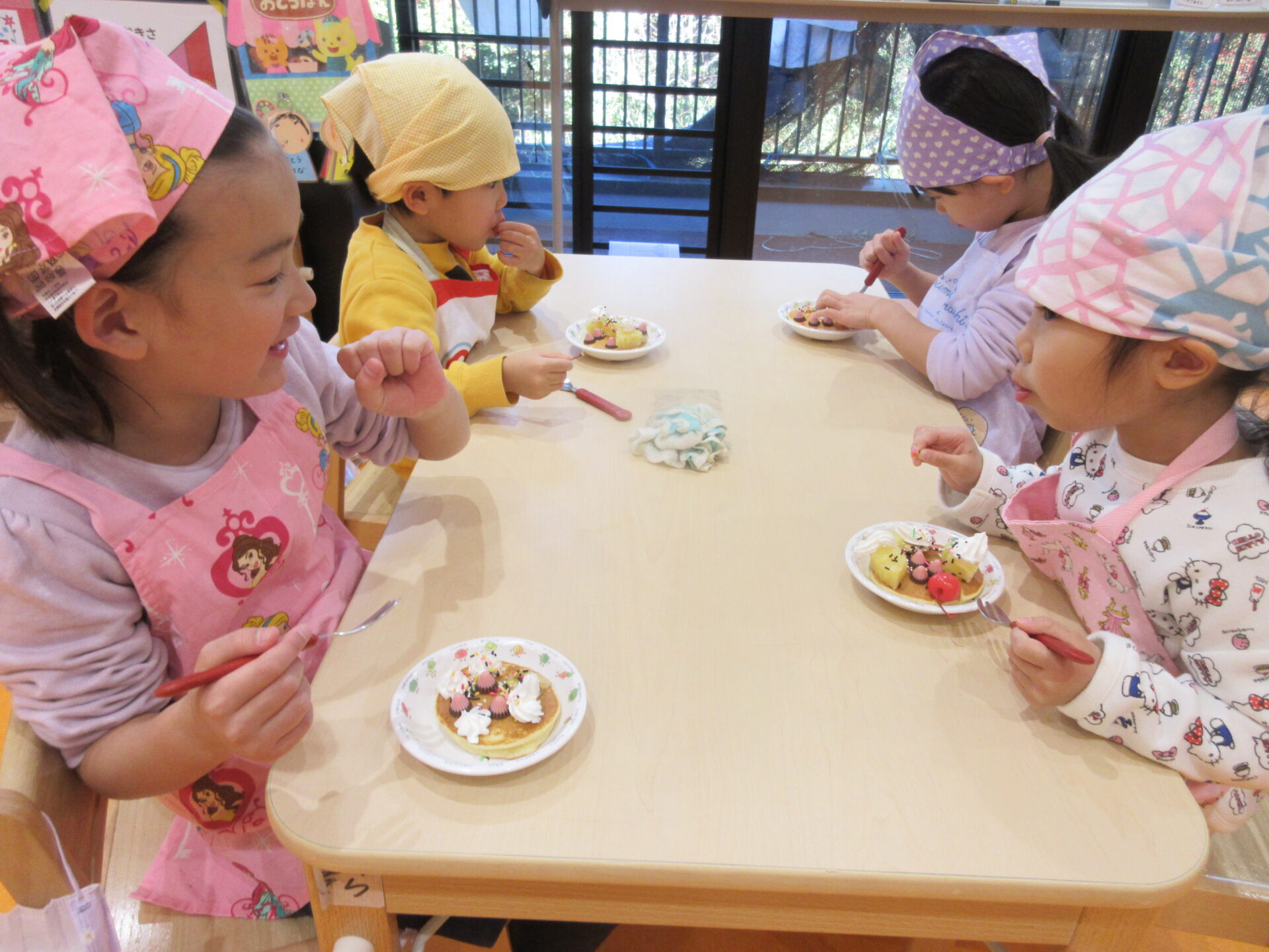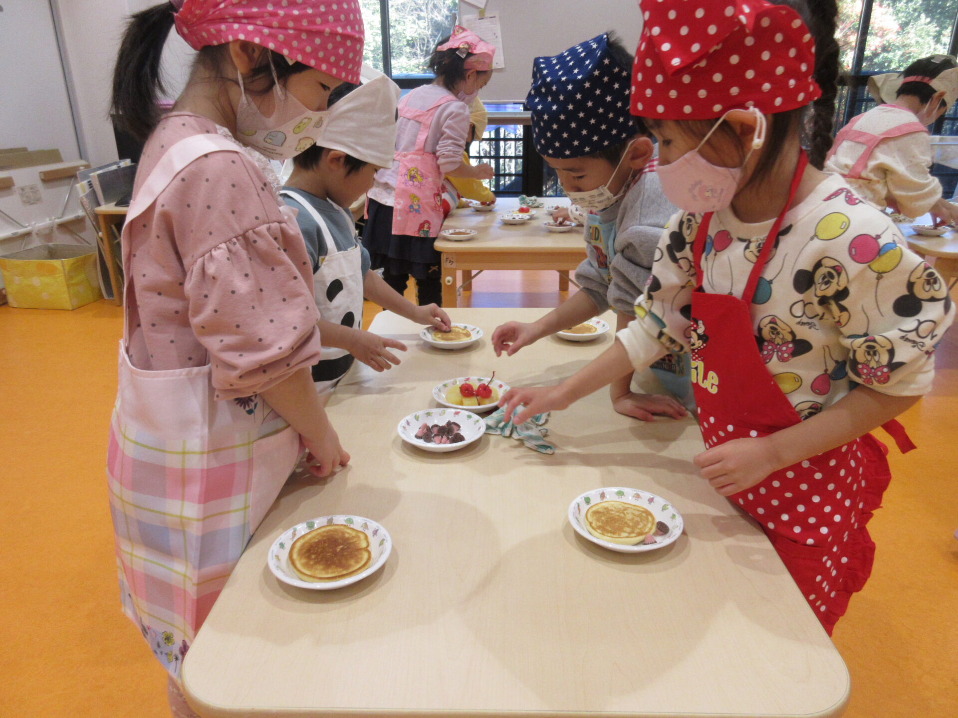 それぞれ好きなトッピングをしておいしそうなホットケーキの完成です✨