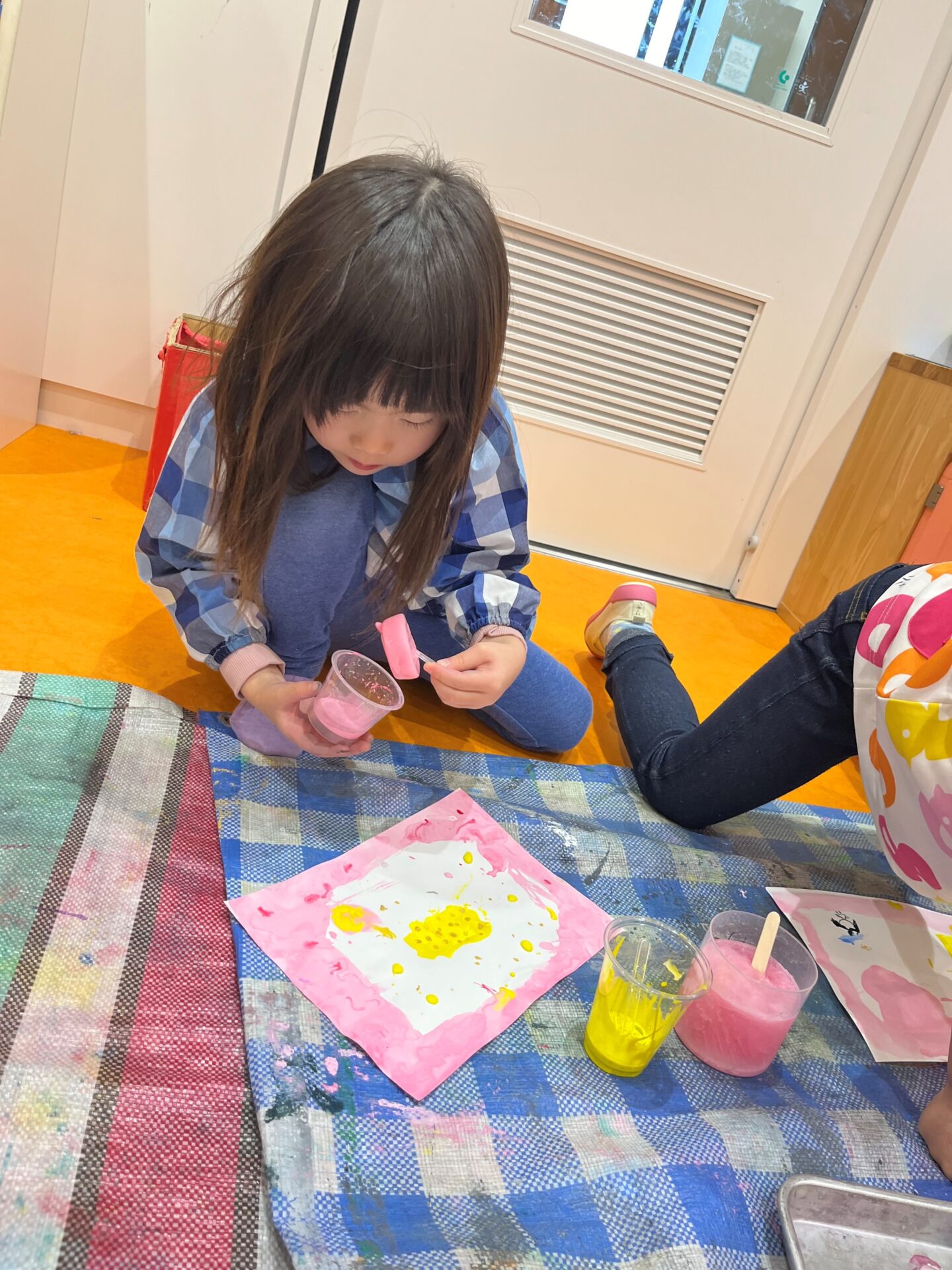白い画用紙の上に、色氷を使って自分の名前を書いたり、女の子の絵を描いたり、