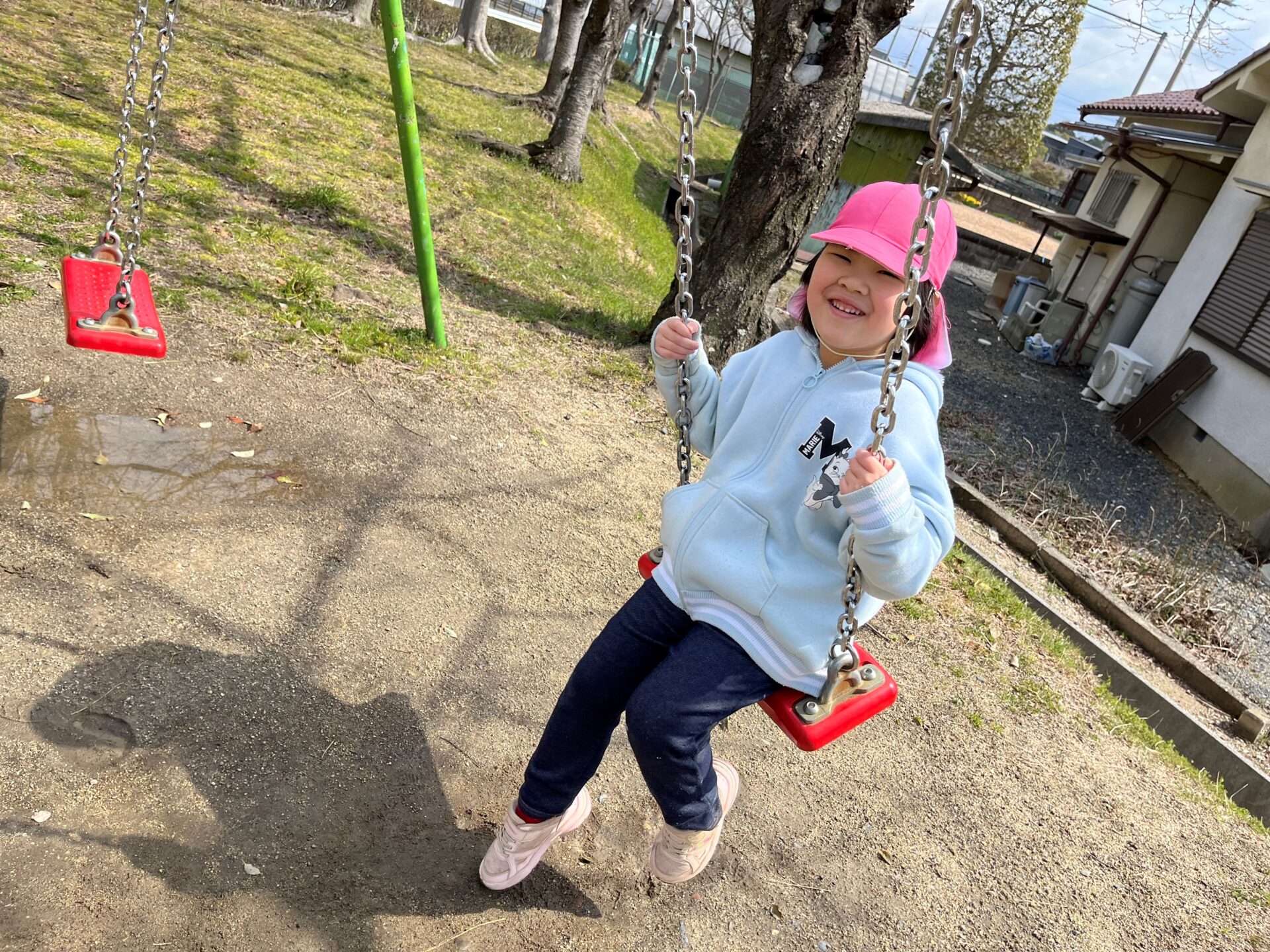 「先生押して~!」とブランコをこいでる子や