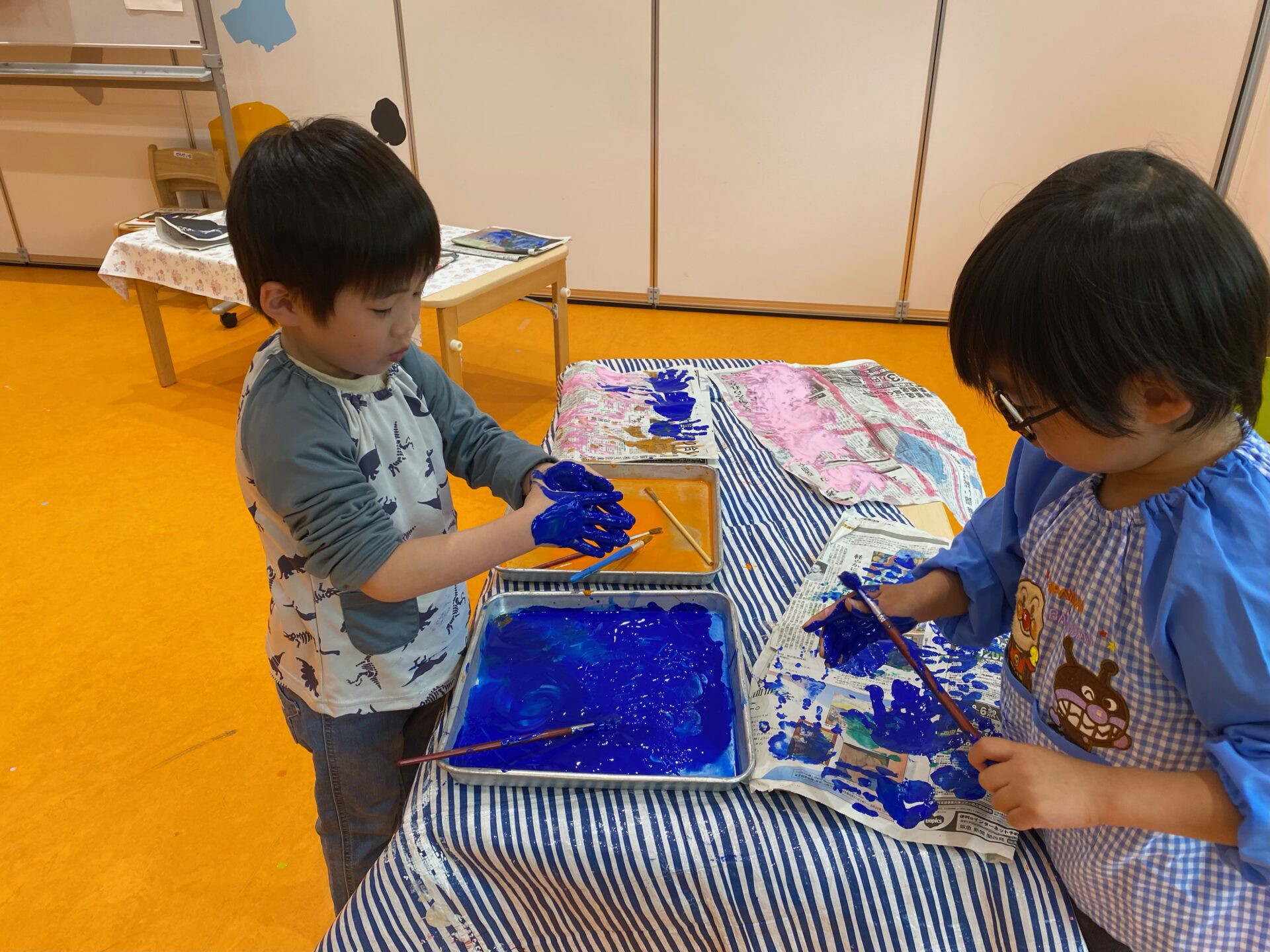 塗った新聞紙は、こいのぼりを作りたい!壁に貼る!など、他に作りたいものに変身させることを楽しみにしている子どもたちです⭐