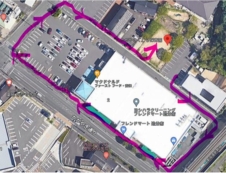 今日の散歩コースは保育園を左に曲がって、フレンドマートを一周するコースです。