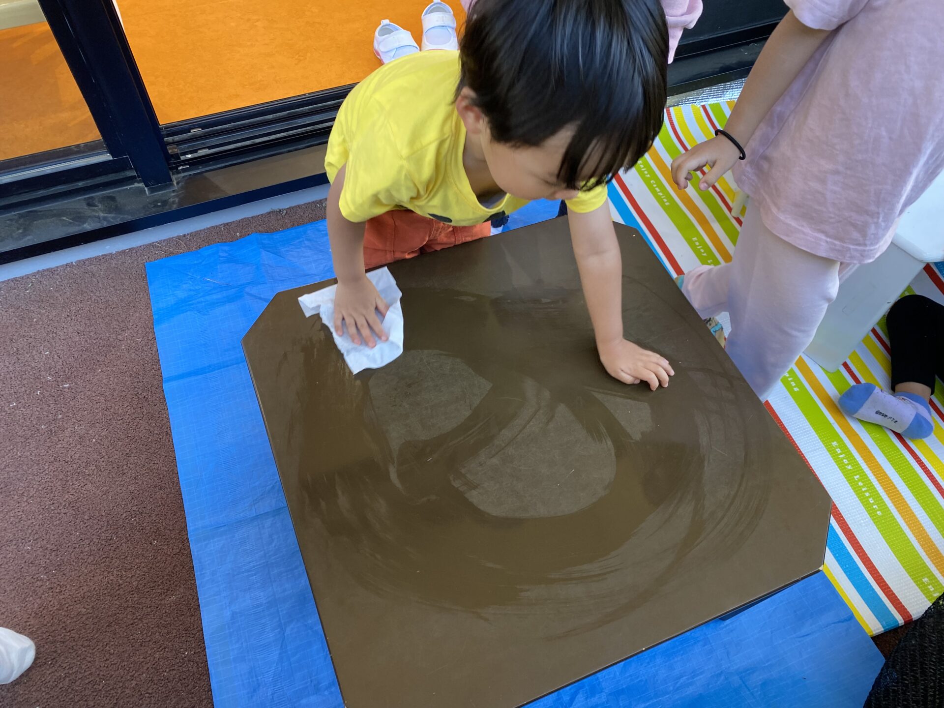 シートを敷いてテーブルを出してみんなでおやつパーティー!