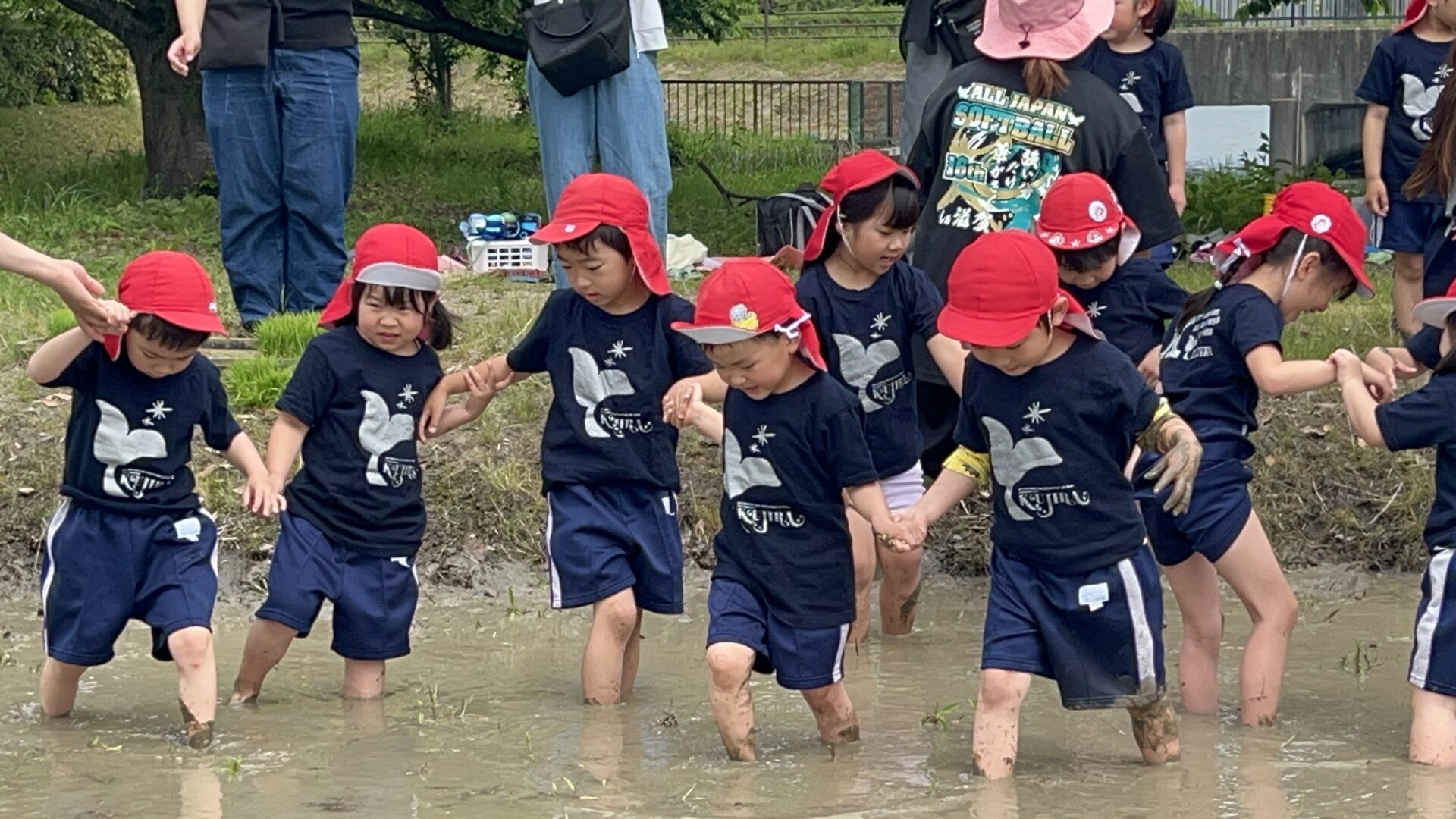 転びそうで、手を繋いで歩いていた子ども達もすぐに慣れ、早速田植えが始まりました。