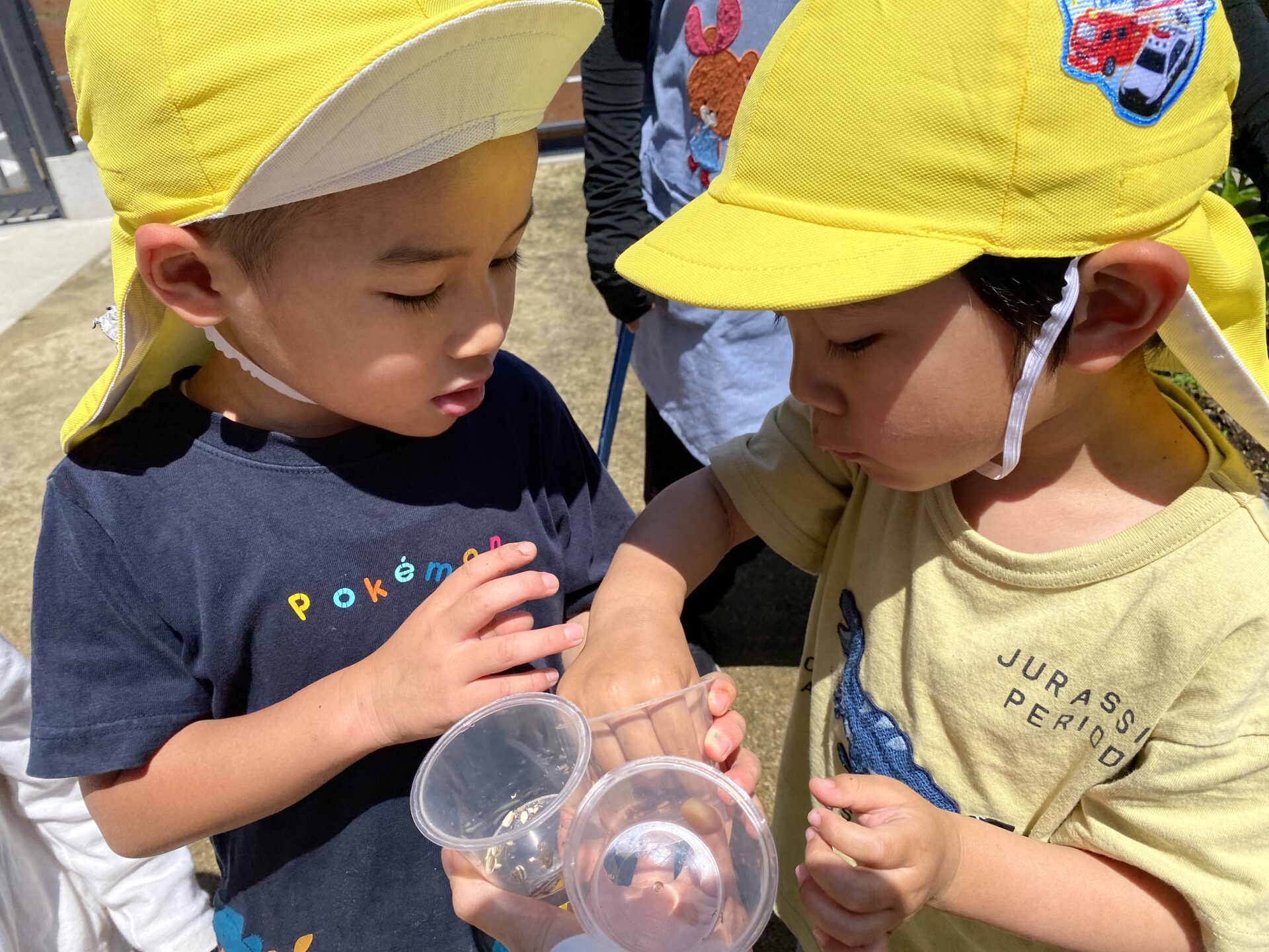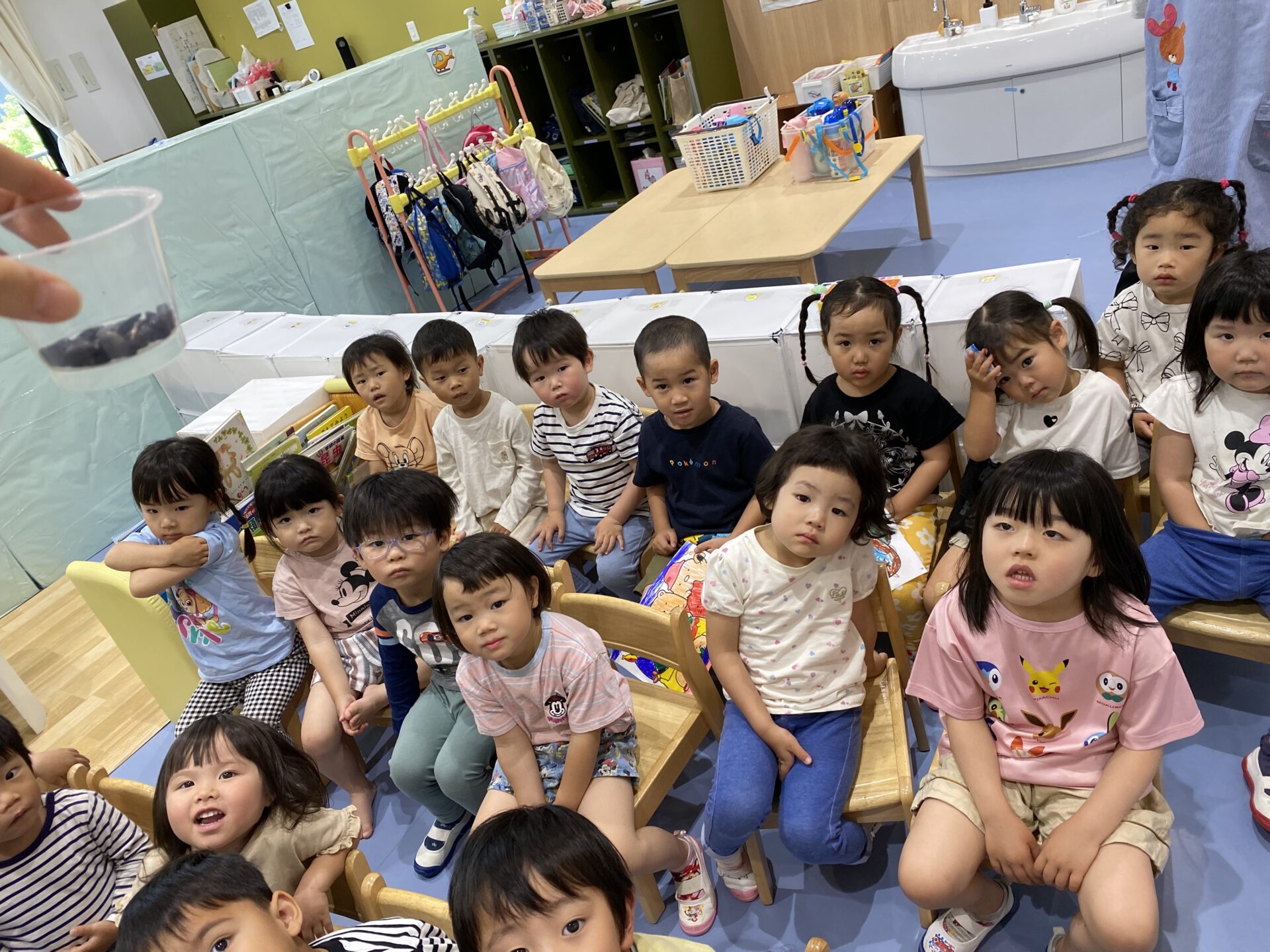 同じひまわりなのに、しましま模様と真っ黒!!コスモスの種は、この前おやつで出た<いりこ大豆>のお魚に似てる!!とお話しする子どもたち🐟
