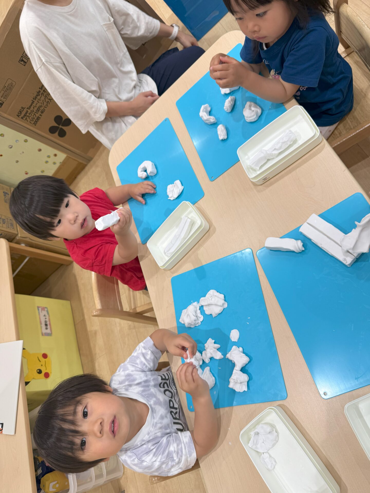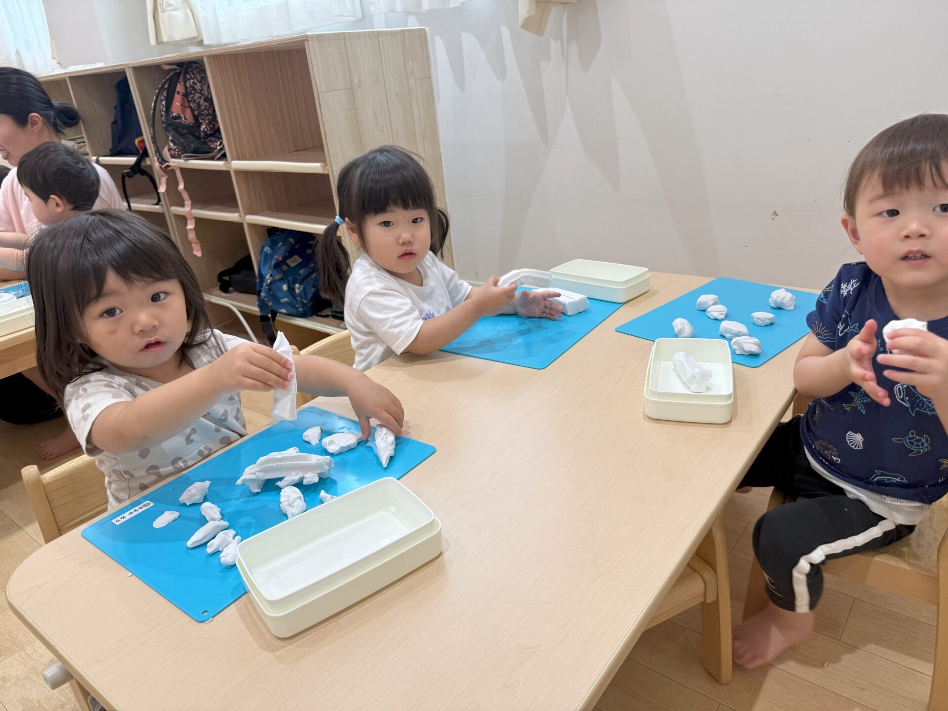 何か分からなくてちょっと不安な様子も。粘土を恐る恐る触ってみたり、ちぎってみたり・・・