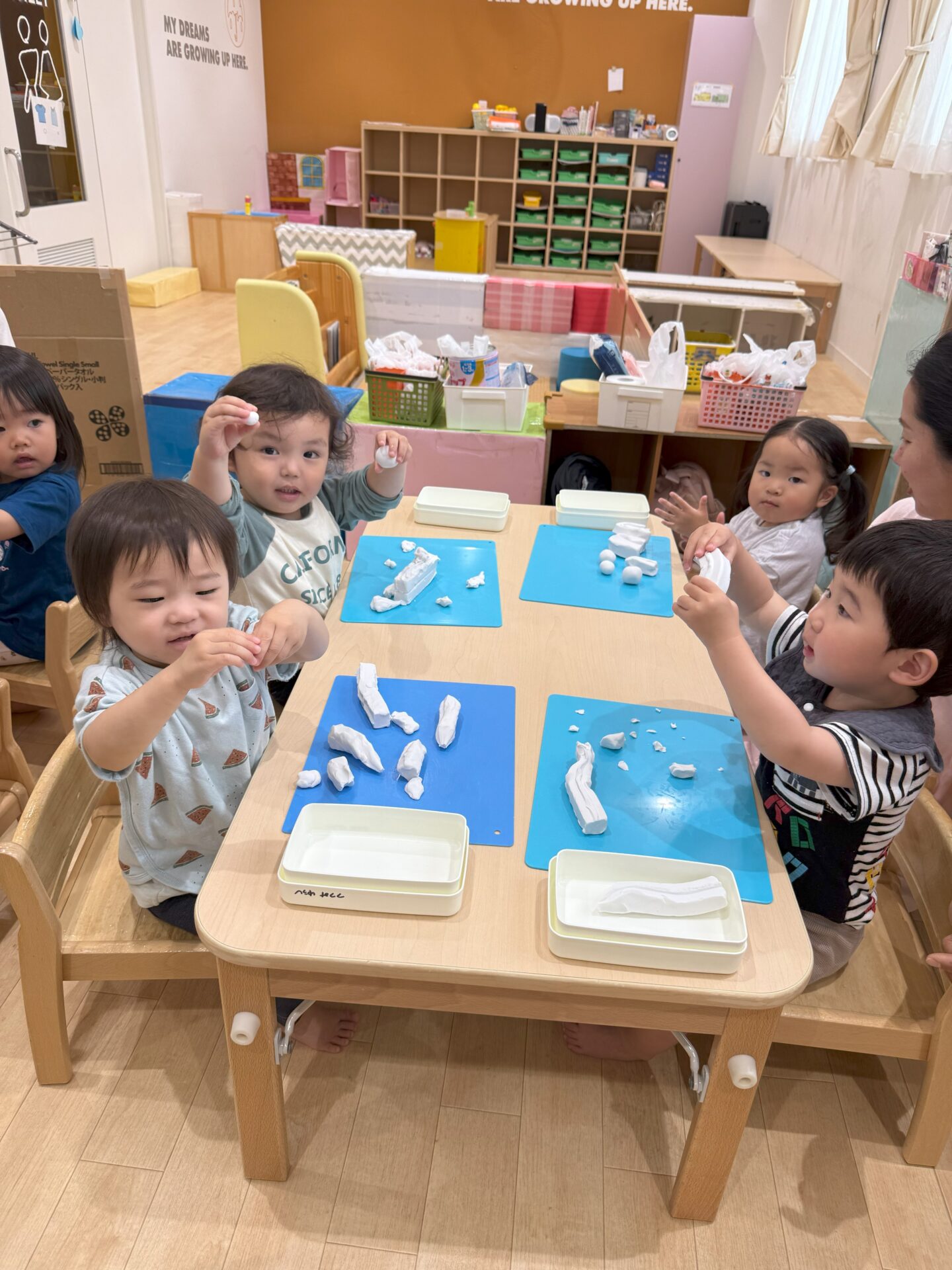 粘土を保育者や友達が触っているのを見て、「やってみたい!!」と粘土を叩いてみたり、丸めてみたり!