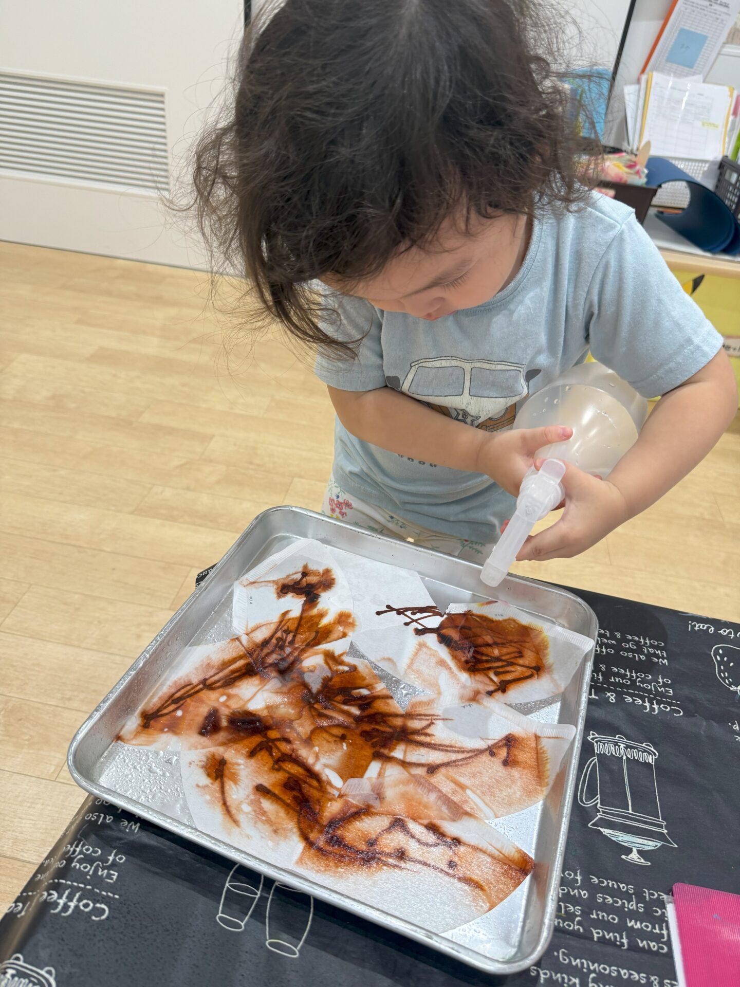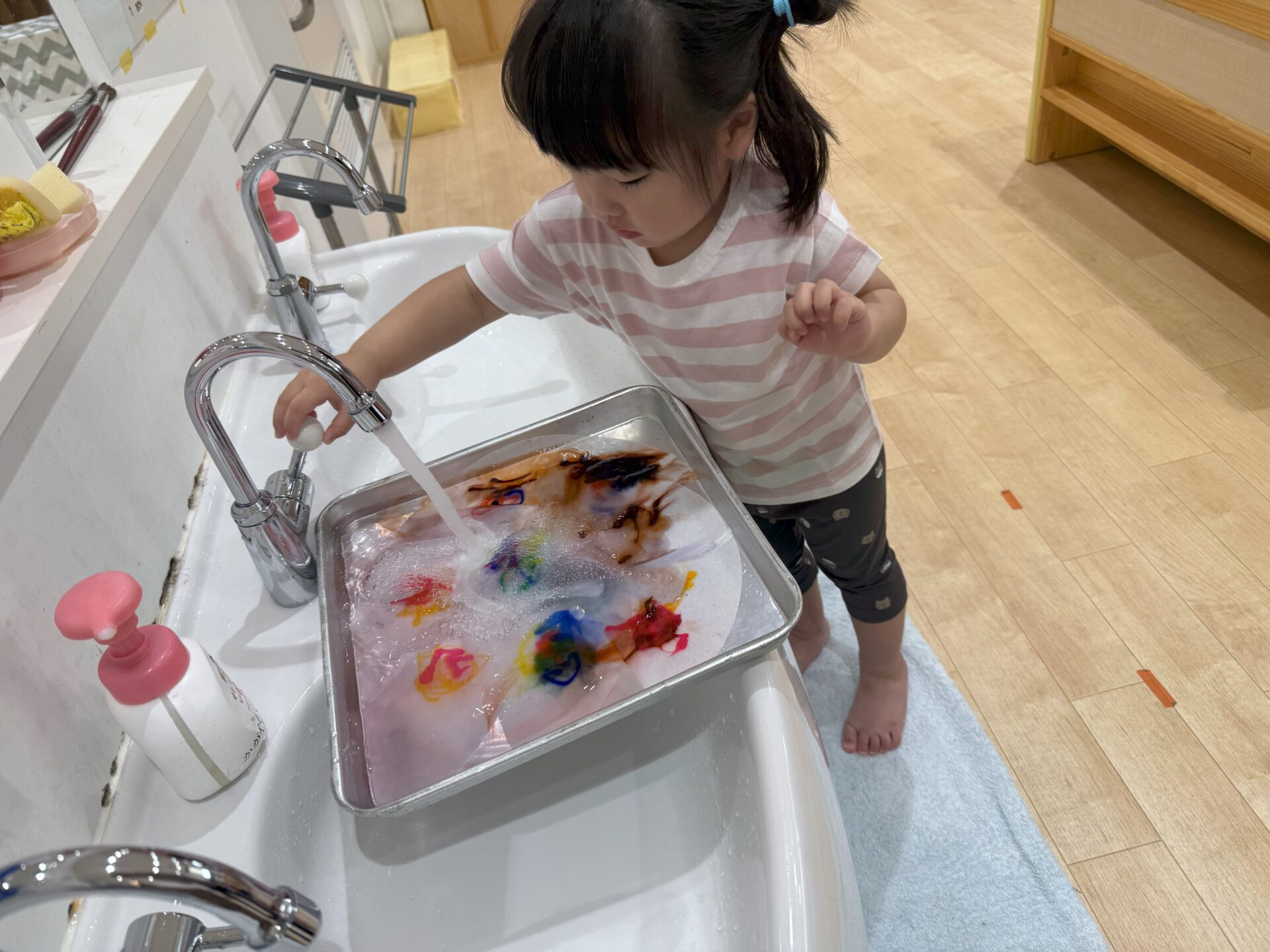 線が水で滲むと「あ!」と指差しをしたり、「きれ~!」と変化に大感動😲