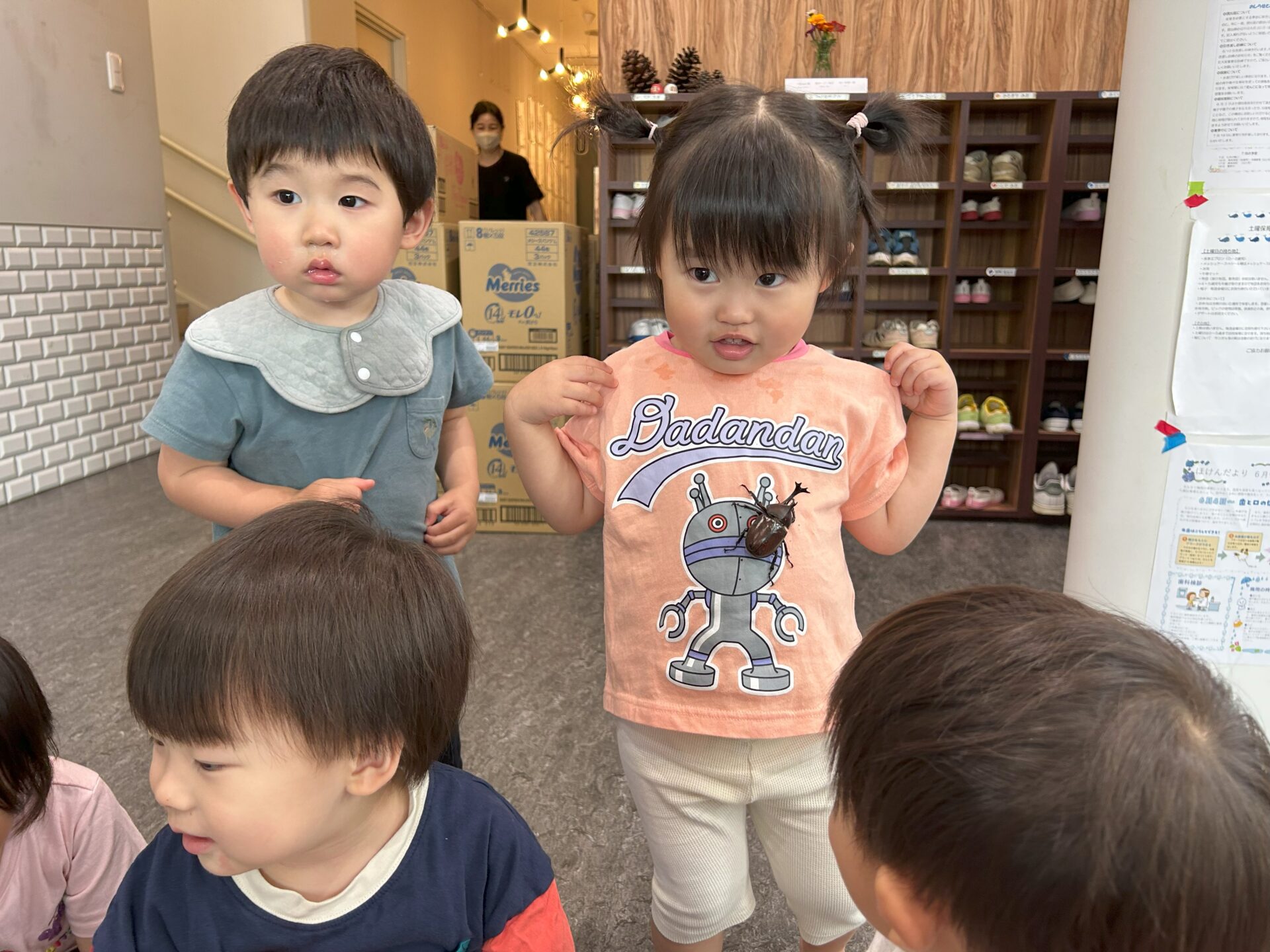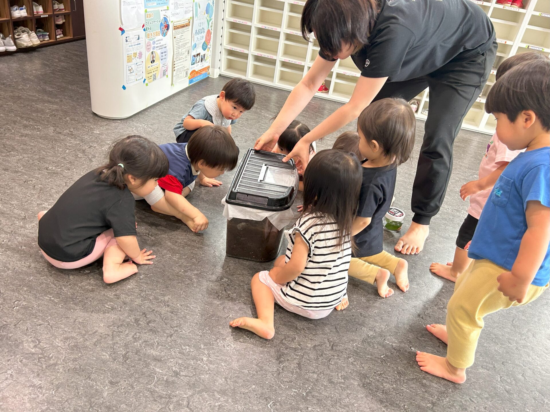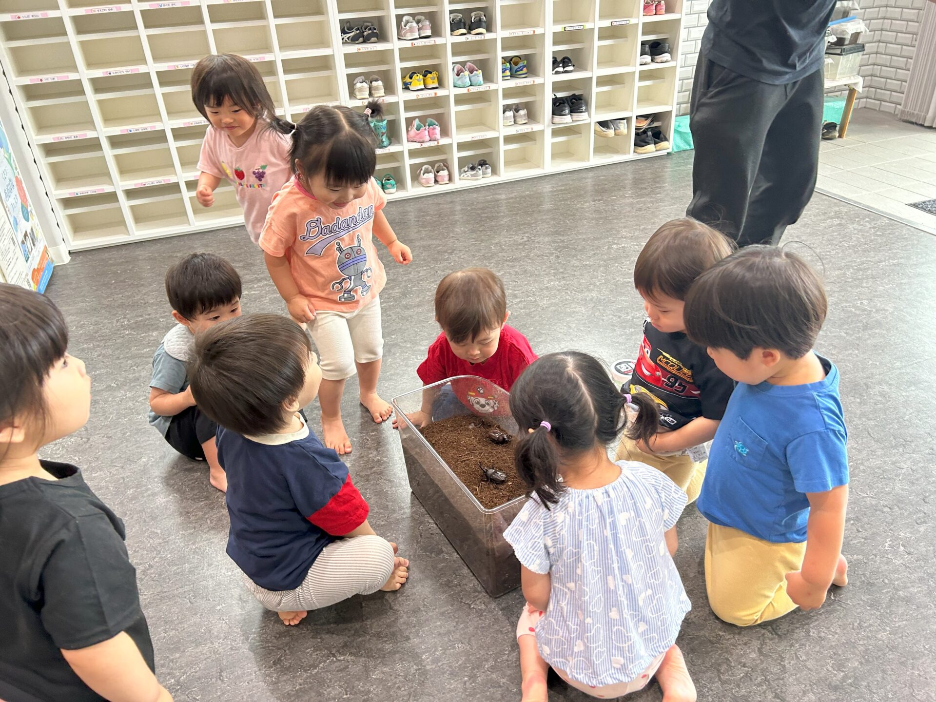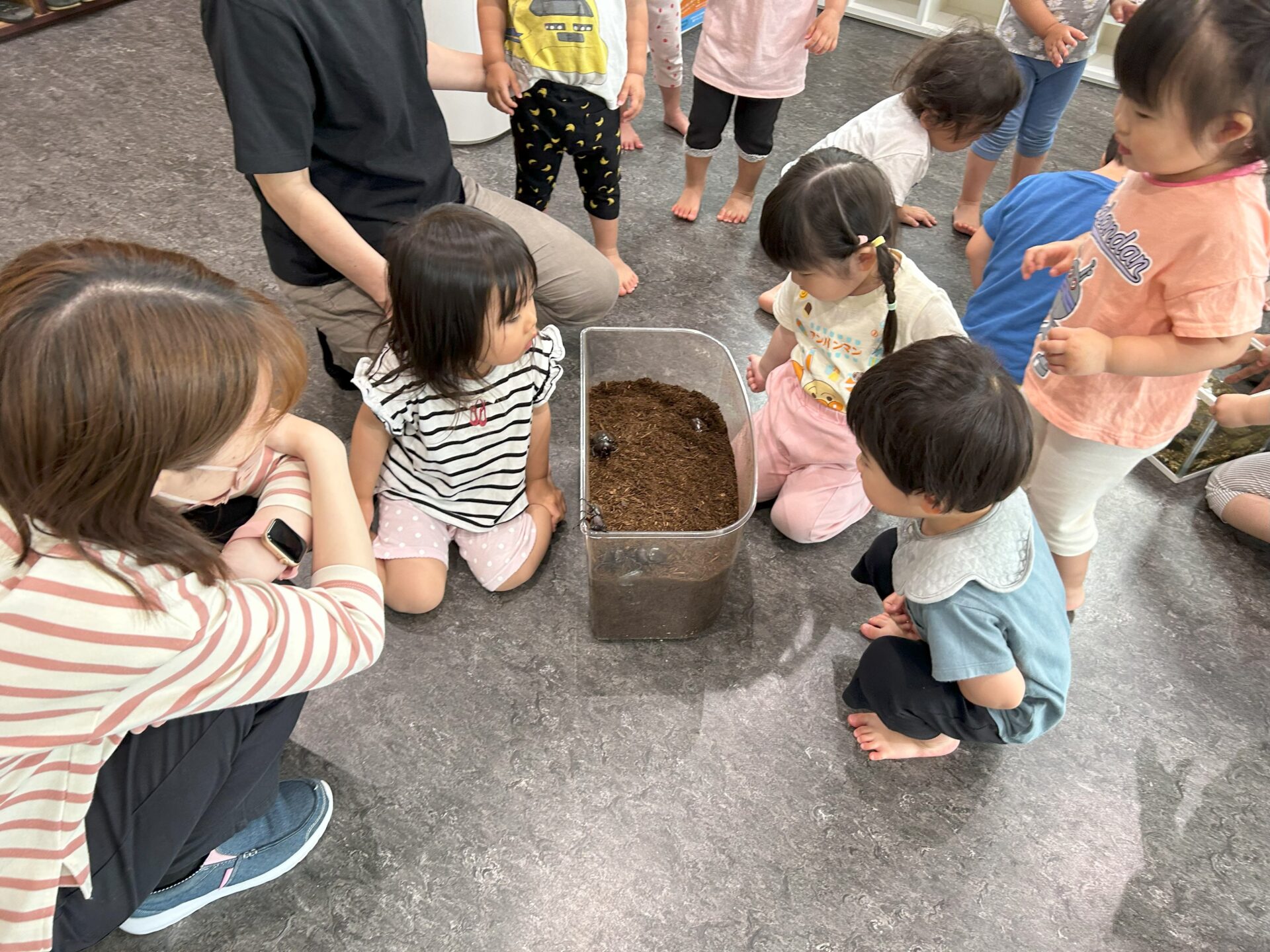 ニンジャくんが歩いているのを見て「おぉ~」と声を上げたり、かたつむりの赤ちゃんを見て「かわいいね~」「○○くんのマークと一緒!」と色んな生き物に触れられた時間でした!