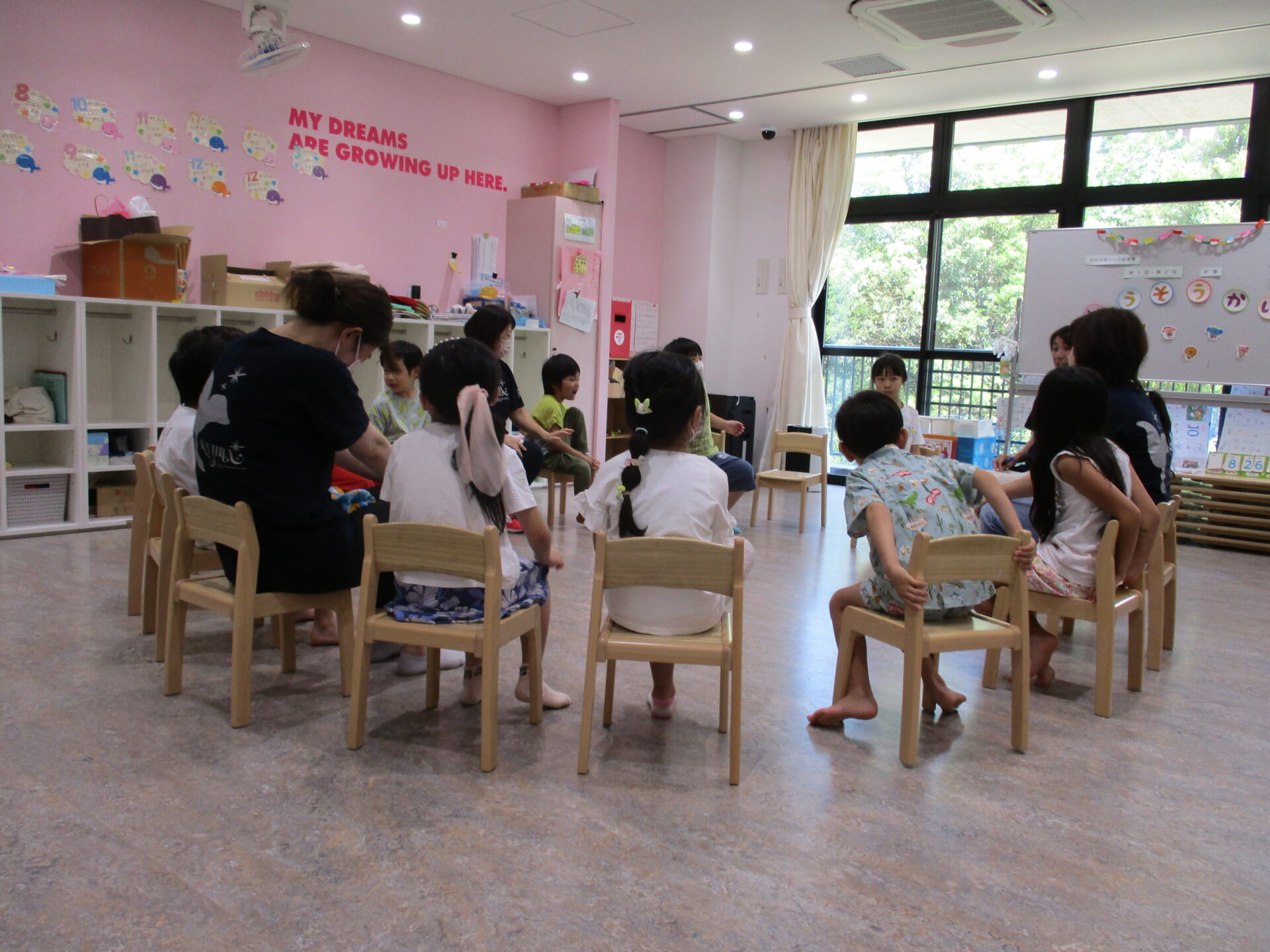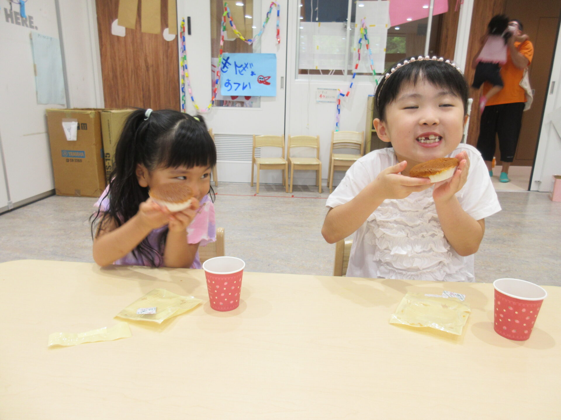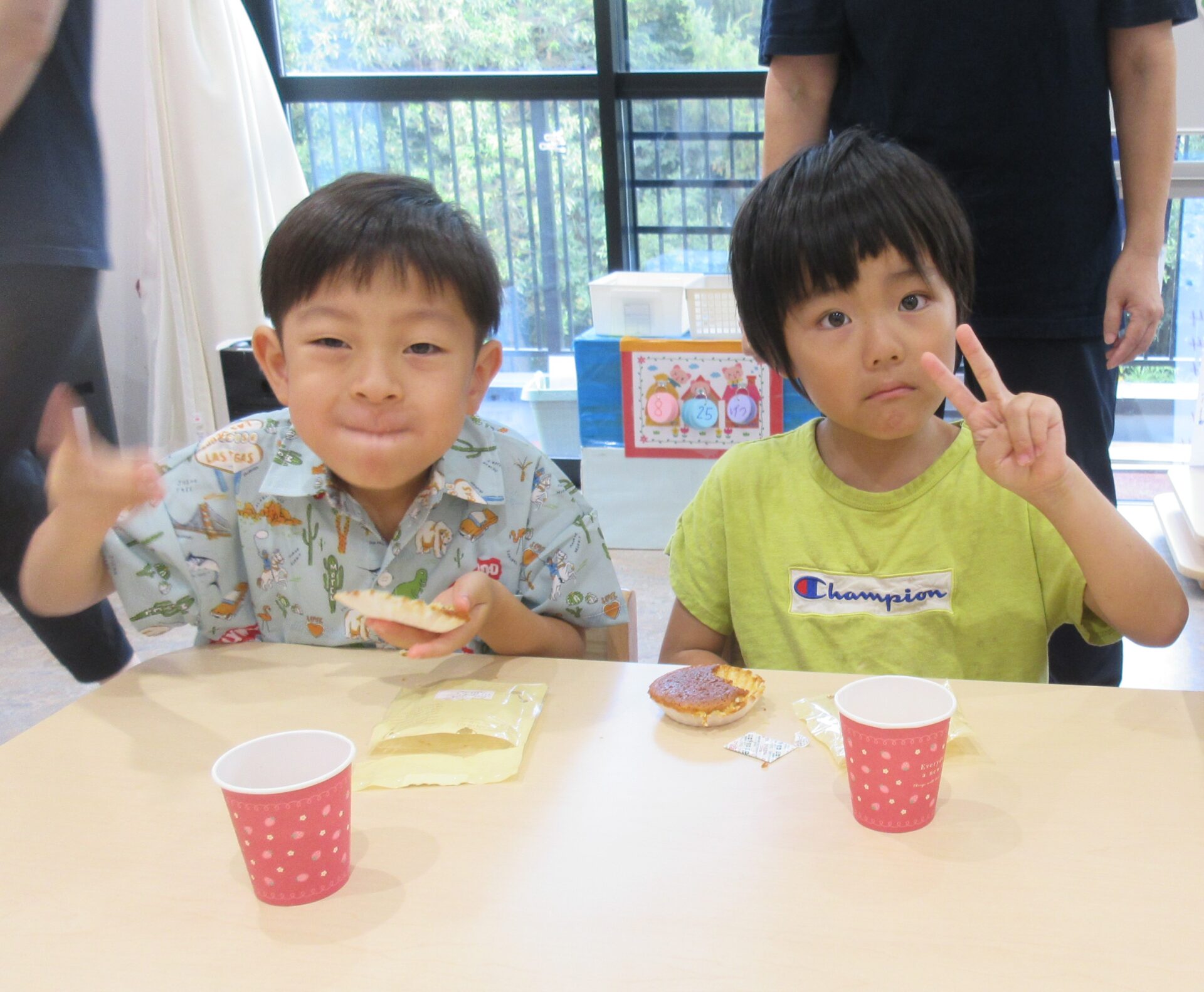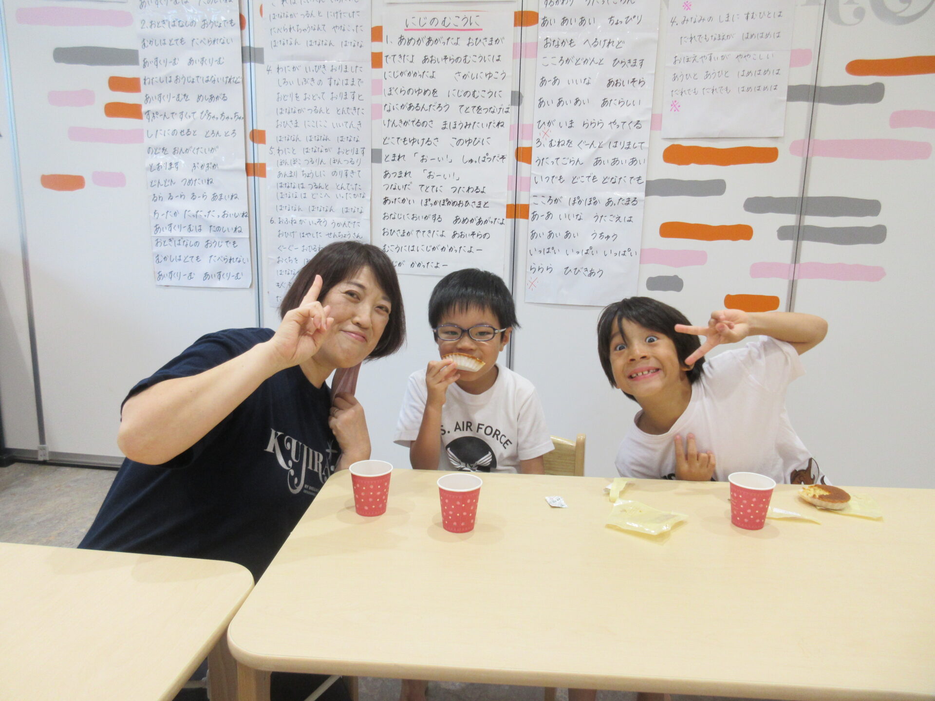 朝の会をしたあと、みんなでおやつを食べました。小学校の話や夏休みの話など大盛り上がりの子どもたち!
