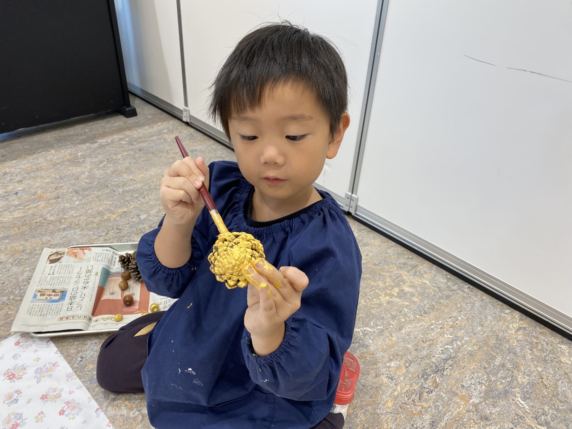 今日はクリスマスに向けて、リースづくりを行いました!くじらチームでは、遠足で拾ってきたどんぐり、松ぼっくりなどの木の実を使って作ります🍂