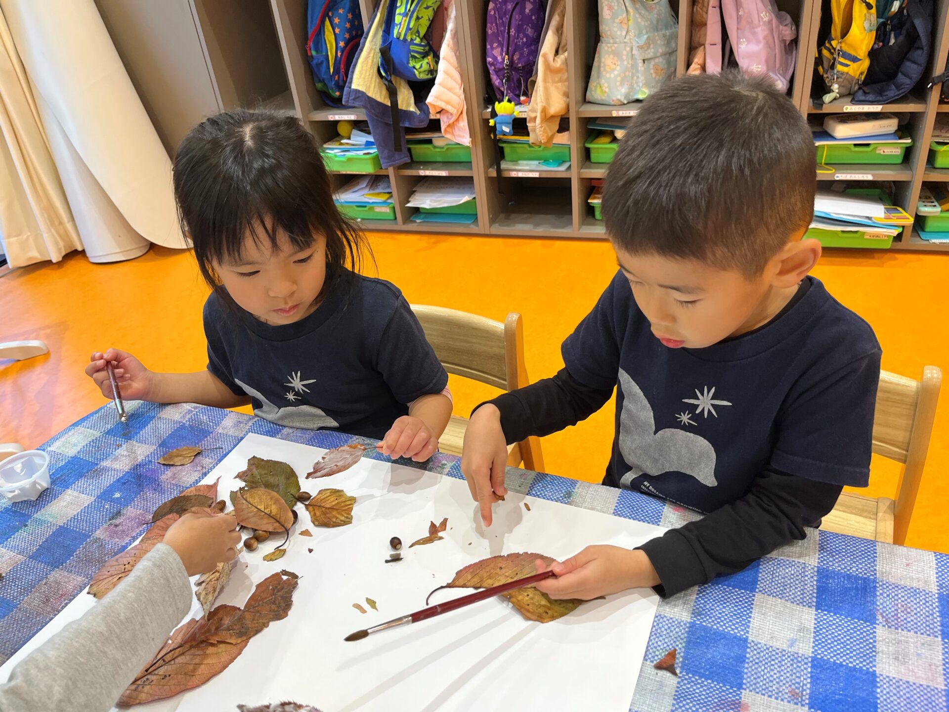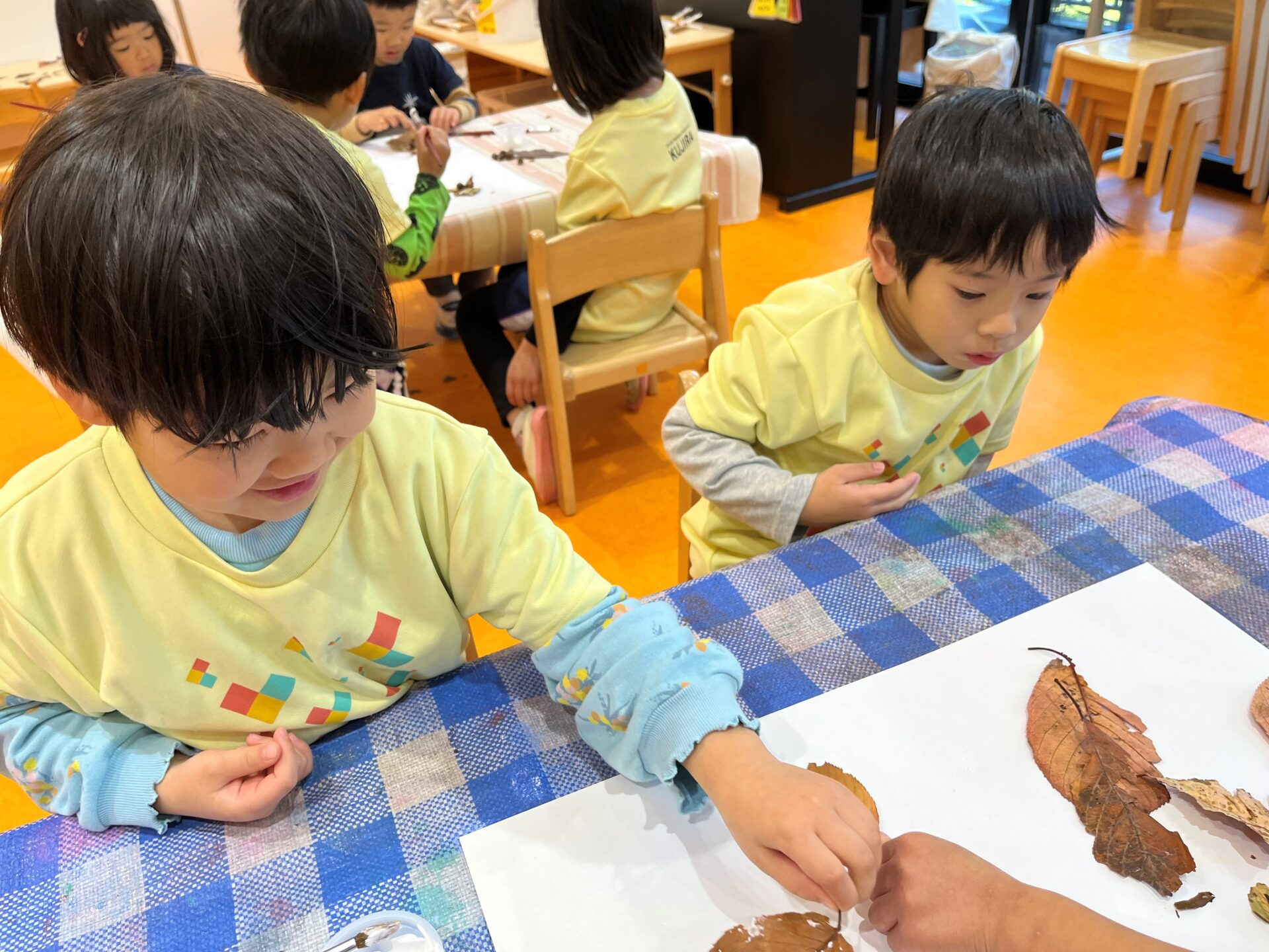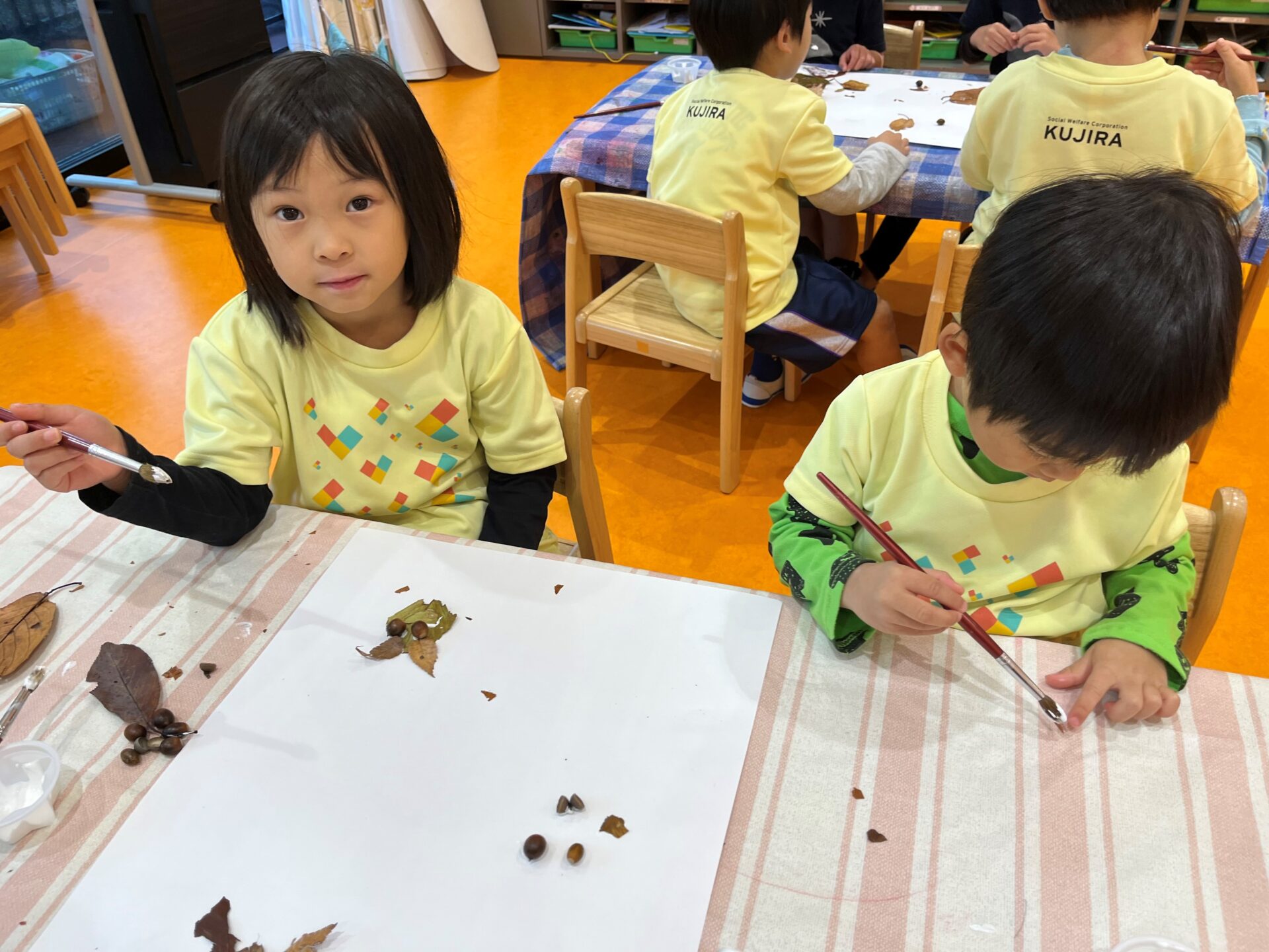 今日は落ち葉やどんぐりを使って製作をしました!