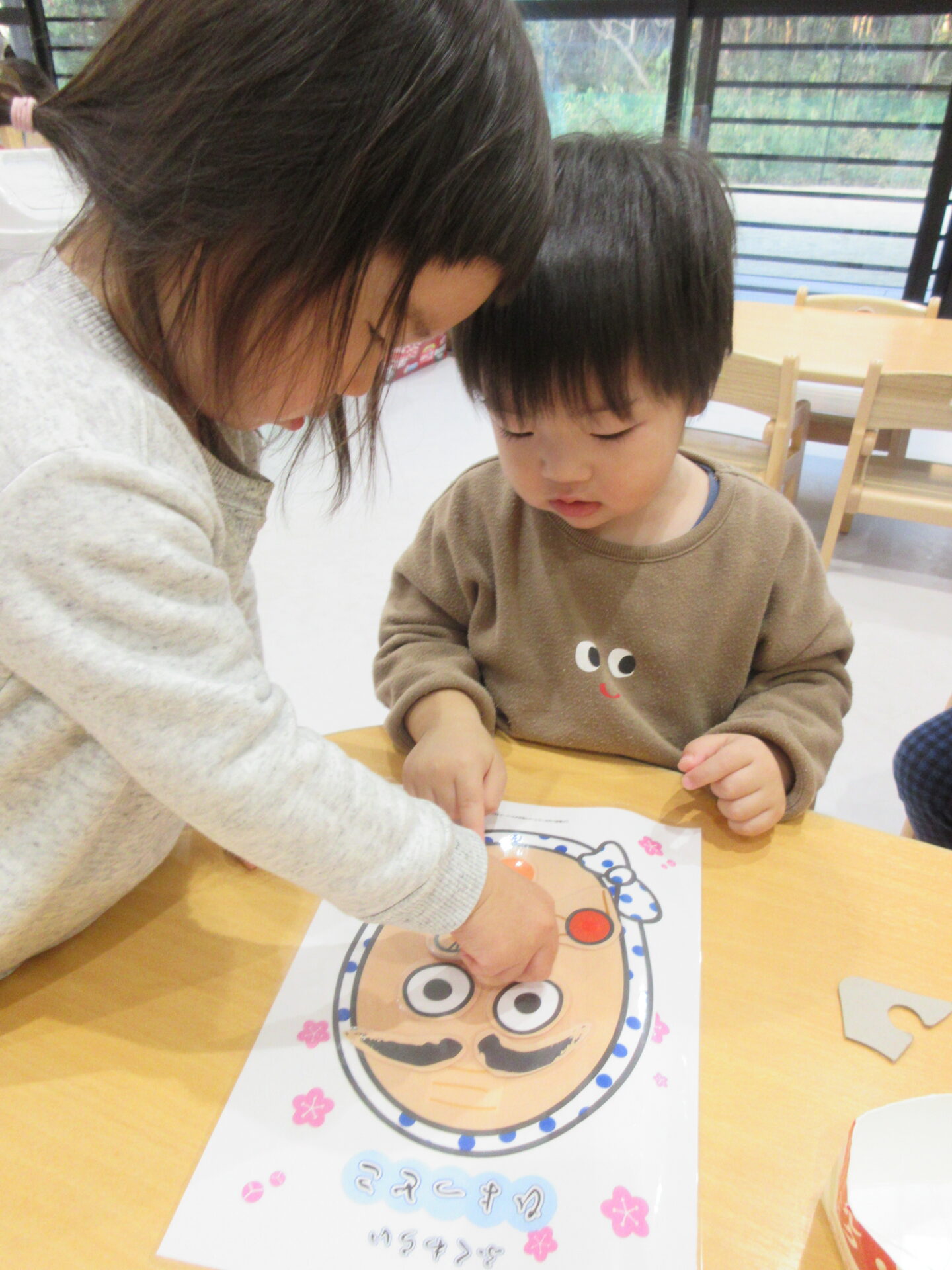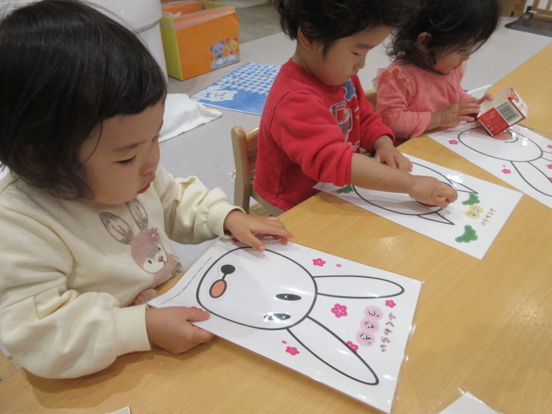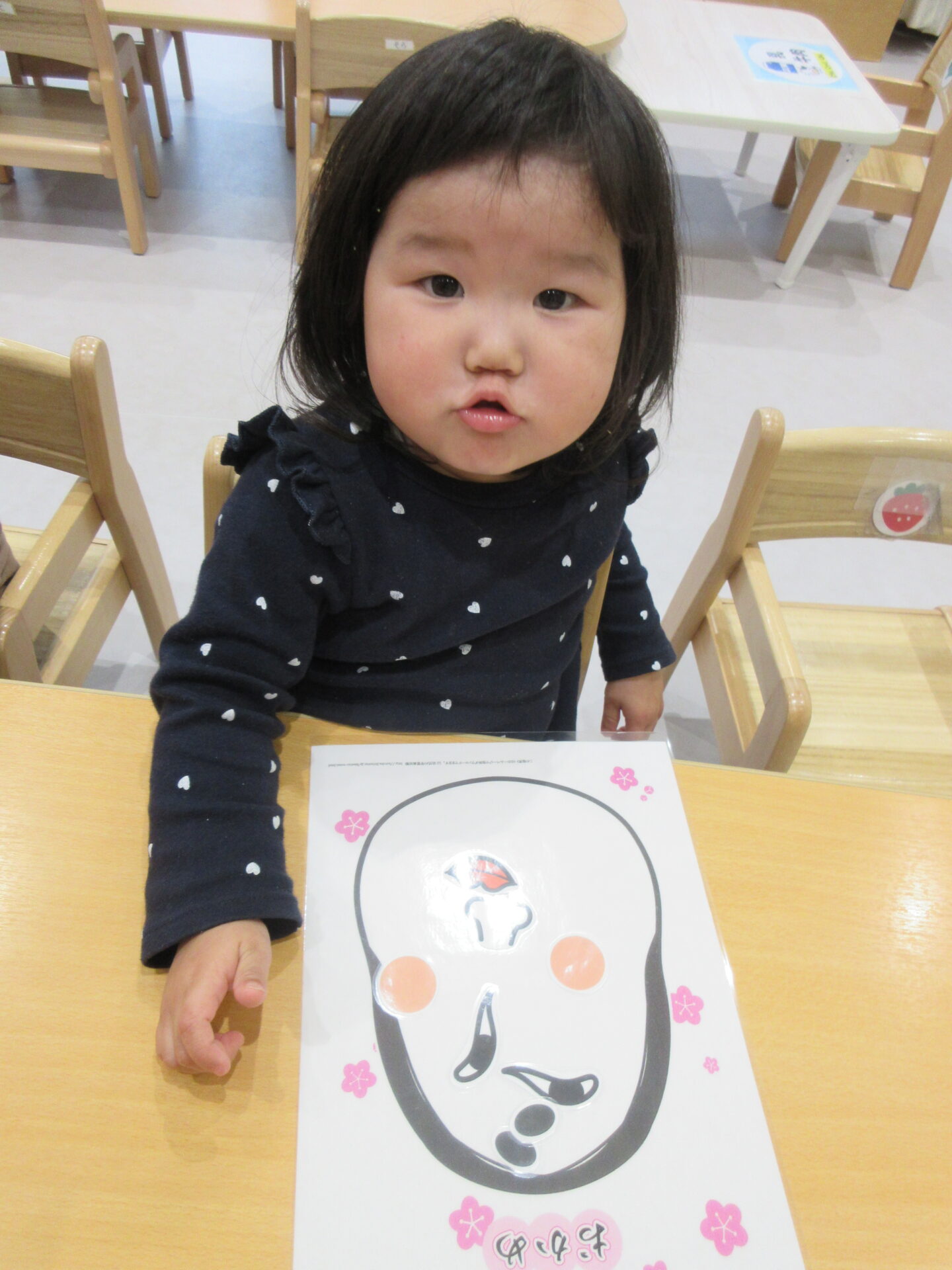 お正月にちなんで手作り福笑いで遊びました。動物の輪郭だけを見せてだれか聞くと「うさぎさん!」と答えてくれました。
